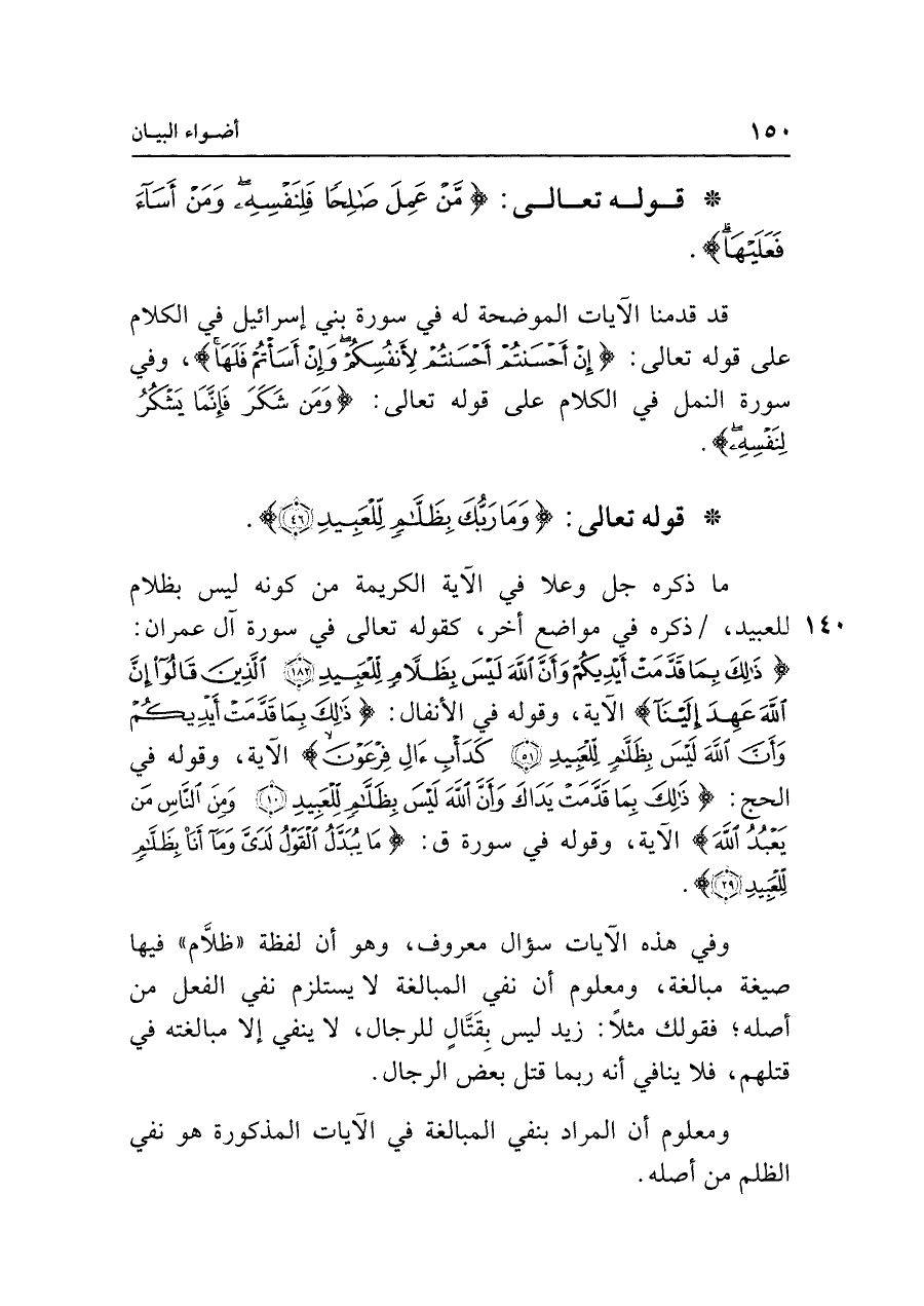 ما ذكره جل وعلا في الآية الكريمة من كونه ليس بظلام للعبيد، ذكره في مواضع أخر، كقوله تعالى في سورة آل عمران: {ذَلِكَ بِمَا قَدَّمَتْ أَيْدِيكُمْ وَأَنَّ اللَّهَ لَيْسَ بِظَلَّامٍ لِلْعَبِيدِ (١٨٢) الَّذِينَ قَالُوا إِنَّ اللَّهَ عَهِدَ إِلَيْنَا} الآية، وقوله في الأنفال: {ذَلِكَ بِمَا قَدَّمَتْ أَيْدِيكُمْ وَأَنَّ اللَّهَ لَيْسَ بِظَلَّامٍ لِلْعَبِيدِ (٥١) كَدَأْبِ آل فِرْعَوْنَ} الآية، وقوله في الحج: {ذَلِكَ بِمَا قَدَّمَتْ يَدَاكَ وَأَنَّ اللَّهَ لَيْسَ بِظَلَّامٍ لِلْعَبِيدِ (١٠) وَمِنَ النَّاسِ مَنْ يَعْبُدُ اللَّهَ} الآية، وقوله في سورة ق: {مَا يُبَدَّلُ الْقَوْلُ لَدَيَّ وَمَا أَنَا بِظَلَّامٍ لِلْعَبِيدِ (٢٩)}.