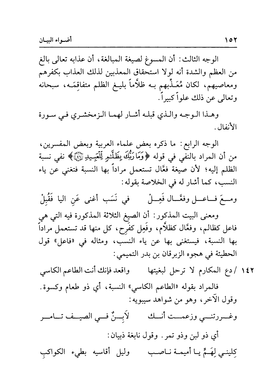 الوجه الرابع: ما ذكره بعض علماء العربية وبعض المفسرين، من أن المراد بالنفي في قوله {وَمَا رَبُّكَ بِظَلَّامٍ لِلْعَبِيدِ (٤٦)} نفي نسبة الظلم إليه؛ لأن صيغة فعَّال تستعمل مرادًا بها النسبة فتغني عن ياء النسب، كما أشار له في الخلاصة بقوله: