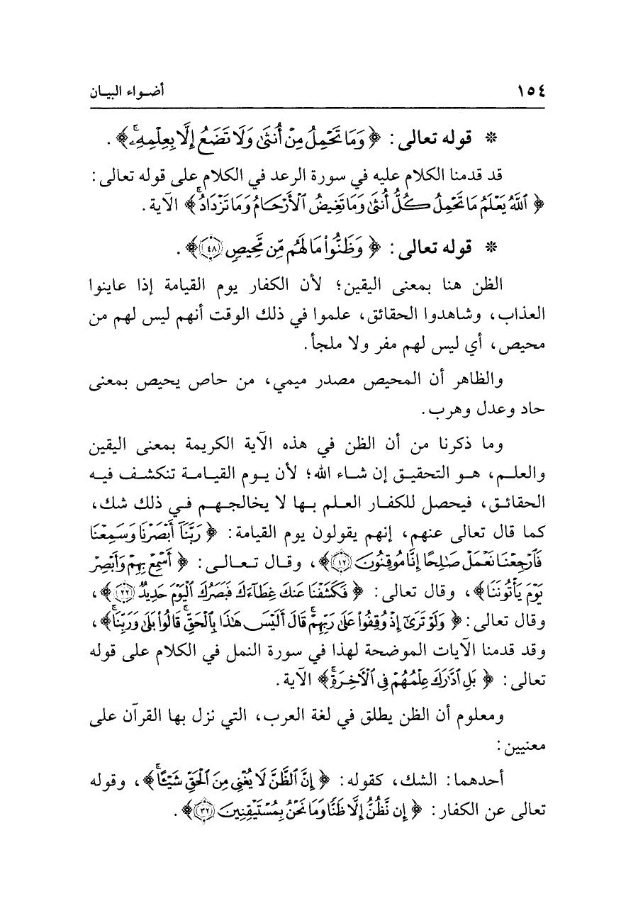 وما ذكرنا من أن الظن في هذه الآية الكريمة بمعنى اليقين والعلم، هو التحقيق إن شاء الله؛ لأن يوم القيامة تنكشف فيه الحقائق، فيحصل للكفار العلم بها لا يخالجهم في ذلك شك، كما قال تعالى عنهم، إنهم يقولون يوم القيامة: {رَبَّنَا أَبْصَرْنَا وَسَمِعْنَا فَارْجِعْنَا نَعْمَلْ صَالِحًا إِنَّا مُوقِنُونَ (١٢)}، وقال تعالى: {أَسْمِعْ بِهِمْ وَأَبْصِرْ يَوْمَ يَأْتُونَنَا}، وقال تعالى: {فَكَشَفْنَا عَنْكَ غِطَاءَكَ فَبَصَرُكَ الْيَوْمَ حَدِيدٌ (٢٢)}، وقال تعالى: {وَلَوْ تَرَى إِذْ وُقِفُوا عَلَى رَبِّهِمْ قَالَ أَلَيْسَ هَذَا بِالْحَقِّ قَالُوا بَلَى وَرَبِّنَا}، وقد قدمنا الآيات الموضحة لهذا في سورة النمل في الكلام على قوله تعالى: {بَلِ ادَّارَكَ عِلْمُهُمْ فِي الْآخِرَةِ} الآية.