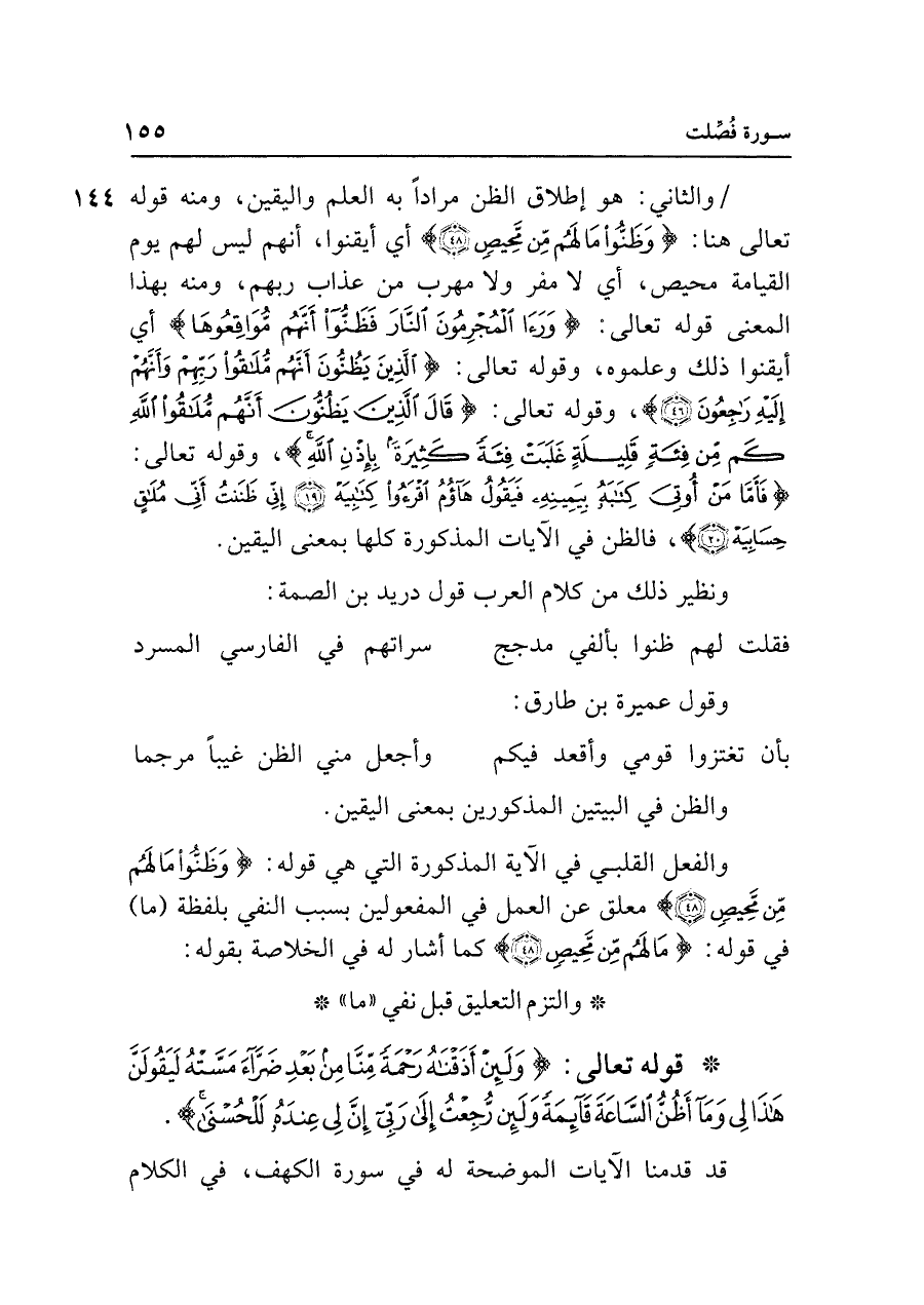 والثاني: هو إطلاق الظن مرادًا به العلم واليقين، ومنه قوله تعالى هنا: {وَظَنُّوا مَا لَهُمْ مِنْ مَحِيصٍ (٤٨)} أي أيقنوا، أنهم ليس لهم يوم القيامة محيص، أي لا مفر ولا مهرب من عذاب ربهم، ومنه بهذا المعنى قوله تعالى: {وَرَأَى الْمُجْرِمُونَ النَّارَ فَظَنُّوا أَنَّهُمْ مُوَاقِعُوهَا} أي أيقنوا ذلك وعلموه، وقوله تعالى: {الَّذِينَ يَظُنُّونَ أَنَّهُمْ مُلَاقُو رَبِّهِمْ وَأَنَّهُمْ إِلَيْهِ رَاجِعُونَ (٤٦)}، وقوله تعالى: {قَالَ الَّذِينَ يَظُنُّونَ أَنَّهُمْ مُلَاقُو اللَّهِ كَمْ مِنْ فِئَةٍ قَلِيلَةٍ غَلَبَتْ فِئَةً كَثِيرَةً بِإِذْنِ اللَّهِ}، وقوله تعالى: {فَأَمَّا مَنْ أُوتِيَ كِتَابَهُ بِيَمِينِهِ فَيَقُولُ هَاؤُمُ اقْرَءُوا كِتَابِيَهْ (١٩) إِنِّي ظَنَنْتُ أَنِّي مُلَاقٍ حِسَابِيَهْ (٢٠)}، فالظن في الآيات المذكورة كلها بمعنى اليقين.