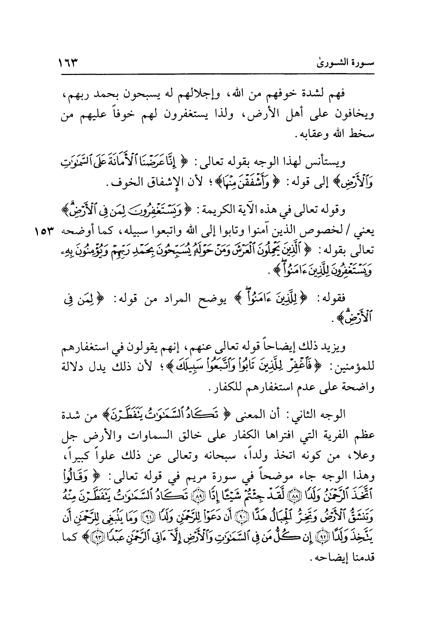 وقوله تعالى في هذه الآية الكريمة: {وَيَسْتَغْفِرُونَ لِمَنْ فِي الْأَرْضِ} يعني لخصوص الذين آمنوا وتابوا إلى الله واتبعوا سبيله، كما أوضحه تعالى بقوله: {الَّذِينَ يَحْمِلُونَ الْعَرْشَ وَمَنْ حَوْلَهُ يُسَبِّحُونَ بِحَمْدِ رَبِّهِمْ وَيُؤْمِنُونَ بِهِ وَيَسْتَغْفِرُونَ لِلَّذِينَ آمَنُوا}.