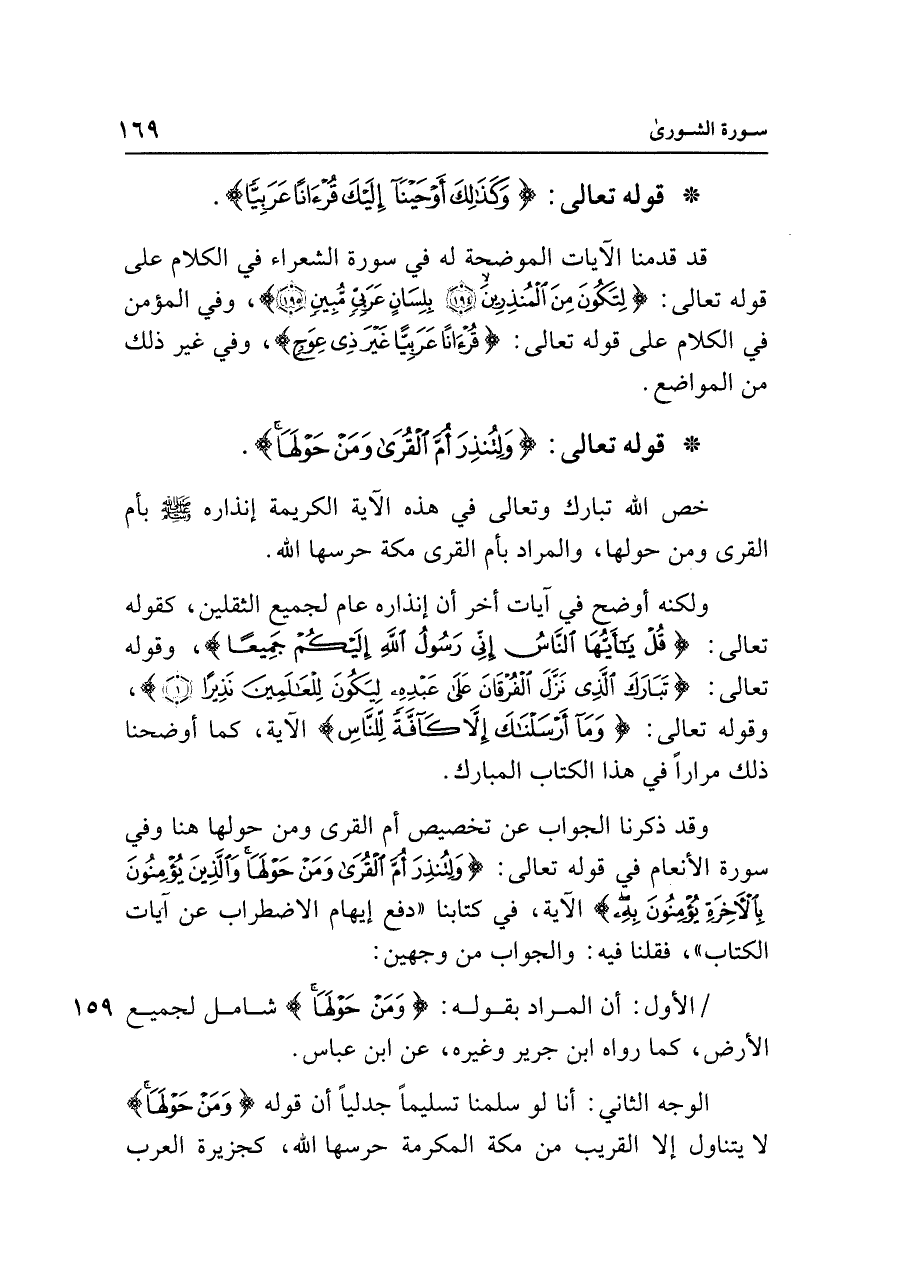 ولكنه أوضح في آيات أخر أن إنذاره عام لجميع الثقلين، كقوله تعالى: {قُلْ يَاأَيُّهَا النَّاسُ إِنِّي رَسُولُ اللَّهِ إِلَيْكُمْ جَمِيعًا}، وقوله تعالى: {تَبَارَكَ الَّذِي نَزَّلَ الْفُرْقَانَ عَلَى عَبْدِهِ لِيَكُونَ لِلْعَالَمِينَ نَذِيرًا (١)}، وقوله تعالى: {وَمَا أَرْسَلْنَاكَ إِلَّا كَافَّةً لِلنَّاسِ} الآية، كما أوضحنا ذلك مرارًا في هذا الكتاب المبارك.