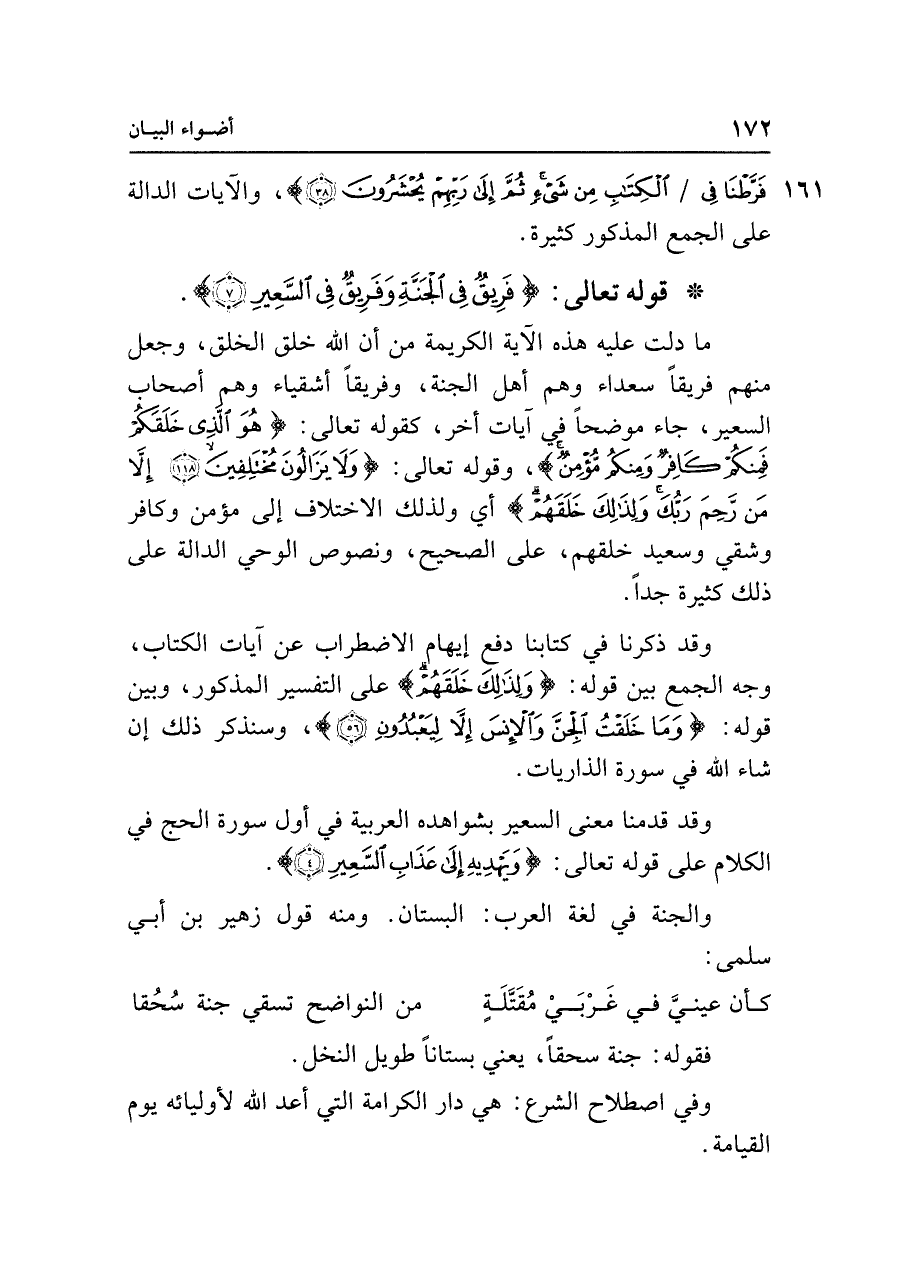 ما دلت عليه هذه الآية الكريمة من أن الله خلق الخلق، وجعل منهم فريقًا سعداء وهم أهل الجنة، وفريقًا أشقياء وهم أصحاب السعير، جاء موضحًا في آيات أخر، كقوله تعالى: {هُوَ الَّذِي خَلَقَكُمْ فَمِنْكُمْ كَافِرٌ وَمِنْكُمْ مُؤْمِنٌ}، وقوله تعالى: {وَلَا يَزَالُونَ مُخْتَلِفِينَ (١١٨) إِلَّا مَنْ رَحِمَ رَبُّكَ وَلِذَلِكَ خَلَقَهُمْ} أي ولذلك الاختلاف إلى مؤمن وكافر وشقي وسعيد خلقهم، على الصحيح، ونصوص الوحي الدالة على ذلك كثيرة جدًّا.
