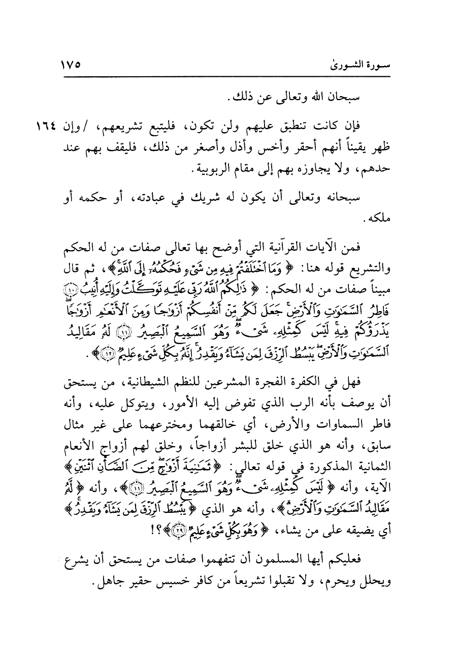 فهل في الكفرة الفجرة المشرعين للنظم الشيطانية، من يستحق أن يوصف بأنه الرب الذي تفوض إليه الأمور، ويتوكل عليه، وأنه فاطر السماوات والأرض، أي خالقهما ومخترعهما على غير مثال سابق، وأنه هو الذي خلق للبشر أزواجًا، وخلق لهم أزواج الأنعام الثمانية المذكورة في قوله تعالى: {ثَمَانِيَةَ أَزْوَاجٍ مِنَ الضَّأْنِ اثْنَينِ} الآية، وأنه {لَيسَ كَمِثْلِهِ شَيءٌ وَهُوَ السَّمِيعُ الْبَصِيرُ (١١)}، وأنه {لَهُ مَقَالِيدُ السَّمَاوَاتِ وَالْأَرْضِ}، وأنه هو الذي {يَبْسُطُ الرِّزْقَ لِمَنْ يَشَاءُ وَيَقْدِرُ} أي يضيقه على من يشاء، {وَهُوَ بِكُلِّ شَيءٍ عَلِيمٌ (٢٩)}؟!