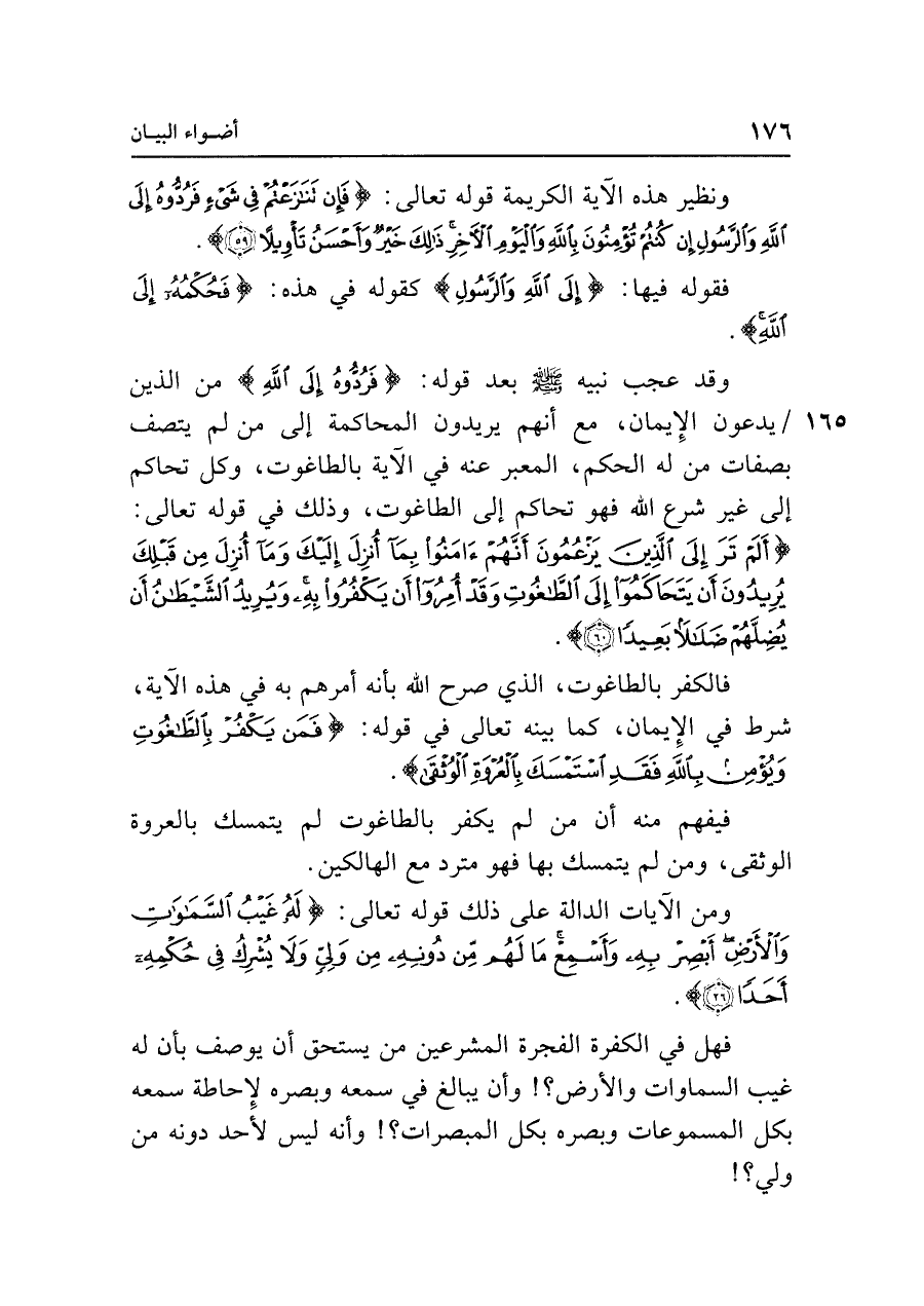 وقد عجب نبيه - صلى الله عليه وسلم - بعد قوله: {فَرُدُّوهُ إِلَى اللَّهِ} من الذين يدعون الإِيمان، مع أنهم يريدون المحاكمة إلى من لم يتصف بصفات من له الحكم، المعبر عنه في الآية بالطاغوت، وكل تحاكم إلى غير شرع الله فهو تحاكم إلى الطاغوت، وذلك في قوله تعالى: {أَلَمْ تَرَ إِلَى الَّذِينَ يَزْعُمُونَ أَنَّهُمْ آمَنُوا بِمَا أُنْزِلَ إِلَيكَ وَمَا أُنْزِلَ مِنْ قَبْلِكَ يُرِيدُونَ أَنْ يَتَحَاكَمُوا إِلَى الطَّاغُوتِ وَقَدْ أُمِرُوا أَنْ يَكْفُرُوا بِهِ وَيُرِيدُ الشَّيطَانُ أَنْ يُضِلَّهُمْ ضَلَالًا بَعِيدًا (٦٠)}.