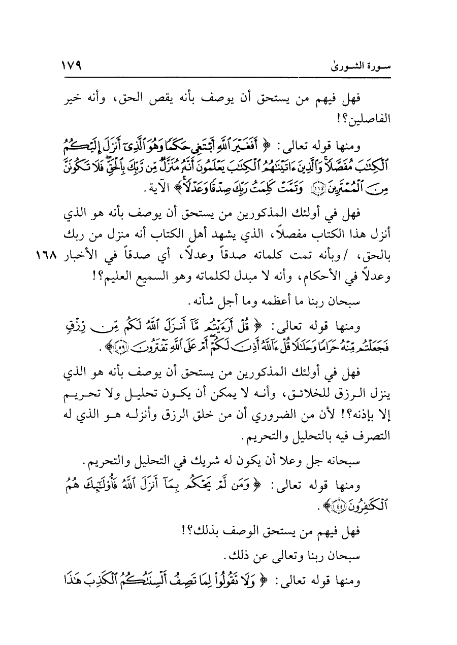 فهل في أولئك المذكورين من يستحق أن يوصف بأنه هو الذي أنزل هذا الكتاب مفصلًا، الذي يشهد أهل الكتاب أنه منزل من ربك بالحق، وبأنه تمت كلماته صدقًا وعدلًا، أي صدقًا في الأخبار وعدلًا في الأحكام، وأنه لا مبدل لكلماته وهو السميع العليم؟!