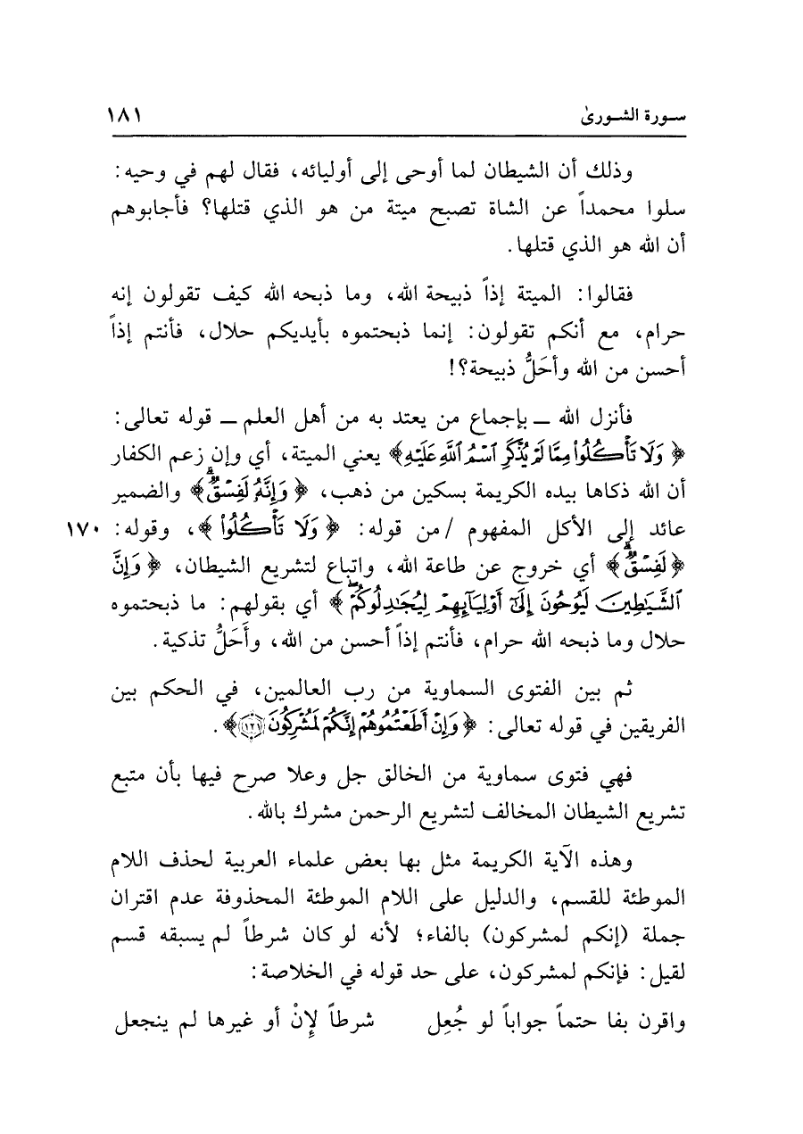 فأنزل الله - بإجماع من يعتد به من أهل العلم - قوله تعالى: {وَلَا تَأْكُلُوا مِمَّا لَمْ يُذْكَرِ اسْمُ اللَّهِ عَلَيهِ} يعني الميتة، أي وإن زعم الكفار أن الله ذكاها بيده الكريمة بسكين من ذهب، {وَإِنَّهُ لَفِسْقٌ} والضمير عائد إلى الأكل المفهوم من قوله: {وَلَا تَأْكُلُوا}، وقوله: {لَفِسْقٌ} أي خروج عن طاعة الله، واتباع لتشريع الشيطان، {وَإِنَّ الشَّيَاطِينَ لَيُوحُونَ إِلَى أَوْلِيَائِهِمْ لِيُجَادِلُوكُمْ} أي بقولهم: ما ذبحتموه حلال وما ذبحه الله حرام، فأنتم إذًا أحسن من الله، وأَحَلُّ تذكية.