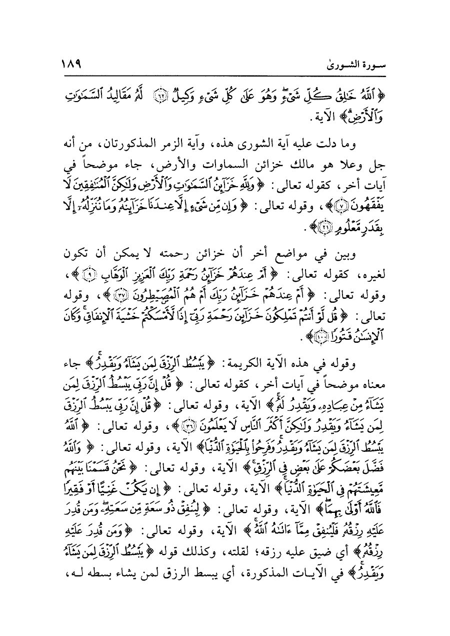 وقوله في هذه الآية الكريمة: {يَبْسُطُ الرِّزْقَ لِمَنْ يَشَاءُ وَيَقْدِرُ} جاء معناه موضحًا في آيات أخر، كقوله تعالى: {قُلْ إِنَّ رَبِّي يَبْسُطُ الرِّزْقَ لِمَنْ يَشَاءُ وَيَقْدِرُ لَهُ} الآية، وقوله تعالى: {قُلْ إِنَّ رَبِّي يَبْسُطُ الرِّزْقَ لِمَنْ يَشَاءُ وَيَقْدِرُ وَلَكِنَّ أَكْثَرَ النَّاسِ لَا يَعْلَمُونَ (٣٦)}، وقوله تعالى: {اللَّهُ يَبْسُطُ الرِّزْقَ لِمَنْ يَشَاءُ وَيَقْدِرُ وَفَرِحُوا بِالْحَيَاةِ الدُّنْيَا} الآية، وقوله تعالى: {وَاللَّهُ فَضَّلَ بَعْضَكُمْ عَلَى بَعْضٍ فِي الرِّزْقِ} الآية، وقوله تعالى: {نَحْنُ قَسَمْنَا بَينَهُمْ مَعِيشَتَهُمْ فِي الْحَيَاةِ الدُّنْيَا} الآية، وقوله تعالى: {إِنْ يَكُنْ غَنِيًّا أَوْ فَقِيرًا فَاللَّهُ أَوْلَى بِهِمَا} الآية، وقوله تعالى: {لِيُنْفِقْ ذُو سَعَةٍ مِنْ سَعَتِهِ وَمَنْ قُدِرَ عَلَيهِ رِزْقُهُ فَلْيُنْفِقْ مِمَّا آتَاهُ اللَّهُ} الآية، وقوله تعالى: {وَمَنْ قُدِرَ عَلَيهِ رِزْقُهُ} أي ضيق عليه رزقه؛ لقلته، وكذلك قوله {يَبْسُطُ الرِّزْقَ لِمَنْ يَشَاءُ وَيَقْدِرُ} في الآيات المذكورة، أي يبسط الرزق لمن يشاء بسطه له،