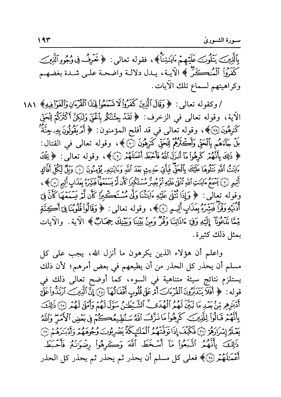 وكقوله تعالى: {وَقَال الَّذِينَ كَفَرُوا لَا تَسْمَعُوا لِهَذَا الْقُرْآنِ وَالْغَوْا فِيهِ} الآية، وقوله تعالى في الزخرف: {لَقَدْ جِئْنَاكُمْ بِالْحَقِّ وَلَكِنَّ أَكْثَرَكُمْ لِلْحَقِّ كَارِهُونَ (٧٨)}، وقوله تعالى في قد أفلح المؤمنون: {أَمْ يَقُولُونَ بِهِ جِنَّةٌ بَلْ جَاءَهُمْ بِالْحَقِّ وَأَكْثَرُهُمْ لِلْحَقِّ كَارِهُونَ (٧٠)}، وقوله تعالى في القتال: {ذَلِكَ بِأَنَّهُمْ كَرِهُوا مَا أَنْزَلَ اللَّهُ فَأَحْبَطَ أَعْمَالهُمْ (٩)}، وقوله تعالى: {تِلْكَ آيَاتُ اللَّهِ نَتْلُوهَا عَلَيكَ بِالْحَقِّ فَبِأَيِّ حَدِيثٍ بَعْدَ اللَّهِ وَآيَاتِهِ يُؤْمِنُونَ (٦) وَيلٌ لِكُلِّ أَفَّاكٍ أَثِيمٍ (٧) يَسْمَعُ آيَاتِ اللَّهِ تُتْلَى عَلَيهِ ثُمَّ يُصِرُّ مُسْتَكْبِرًا كَأَنْ لَمْ يَسْمَعْهَا فَبَشِّرْهُ بِعَذَابٍ أَلِيمٍ (٨)}، وقوله تعالى: {وَإِذَا تُتْلَى عَلَيهِ آيَاتُنَا وَلَّى مُسْتَكْبِرًا كَأَنْ لَمْ يَسْمَعْهَا كَأَنَّ فِي أُذُنَيهِ وَقْرًا فَبَشِّرْهُ بِعَذَابٍ أَلِيمٍ (٧)}، وقوله تعالى: {وَقَالُوا قُلُوبُنَا فِي أَكِنَّةٍ مِمَّا تَدْعُونَا إِلَيهِ وَفِي آذَانِنَا وَقْرٌ وَمِنْ بَينِنَا وَبَينِكَ حِجَابٌ} الآية. والآيات بمثل ذلك كثيرة.