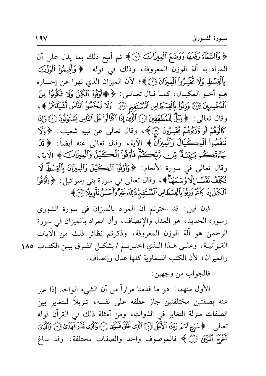 فإن قيل: قد اخترتم أن المراد بالميزان في سورة الشورى وسورة الحديد، هو العدل والإِنصاف، وأن المراد بالميزان في سورة الرحمن هو آلة الوزن المعروفة، وذكرتم نظائر ذلك من الآيات القرآنية، وعلى هذا الذي اخترتم يشكل الفرق بين الكتاب والميزان؛ لأن الكتب السماوية كلها عدل وإنصاف.