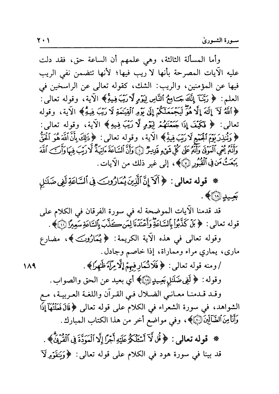 • قوله تعالى: {أَلَا إِنَّ الَّذِينَ يُمَارُونَ فِي السَّاعَةِ لَفِي ضَلَالٍ بَعِيدٍ (١٨)}.