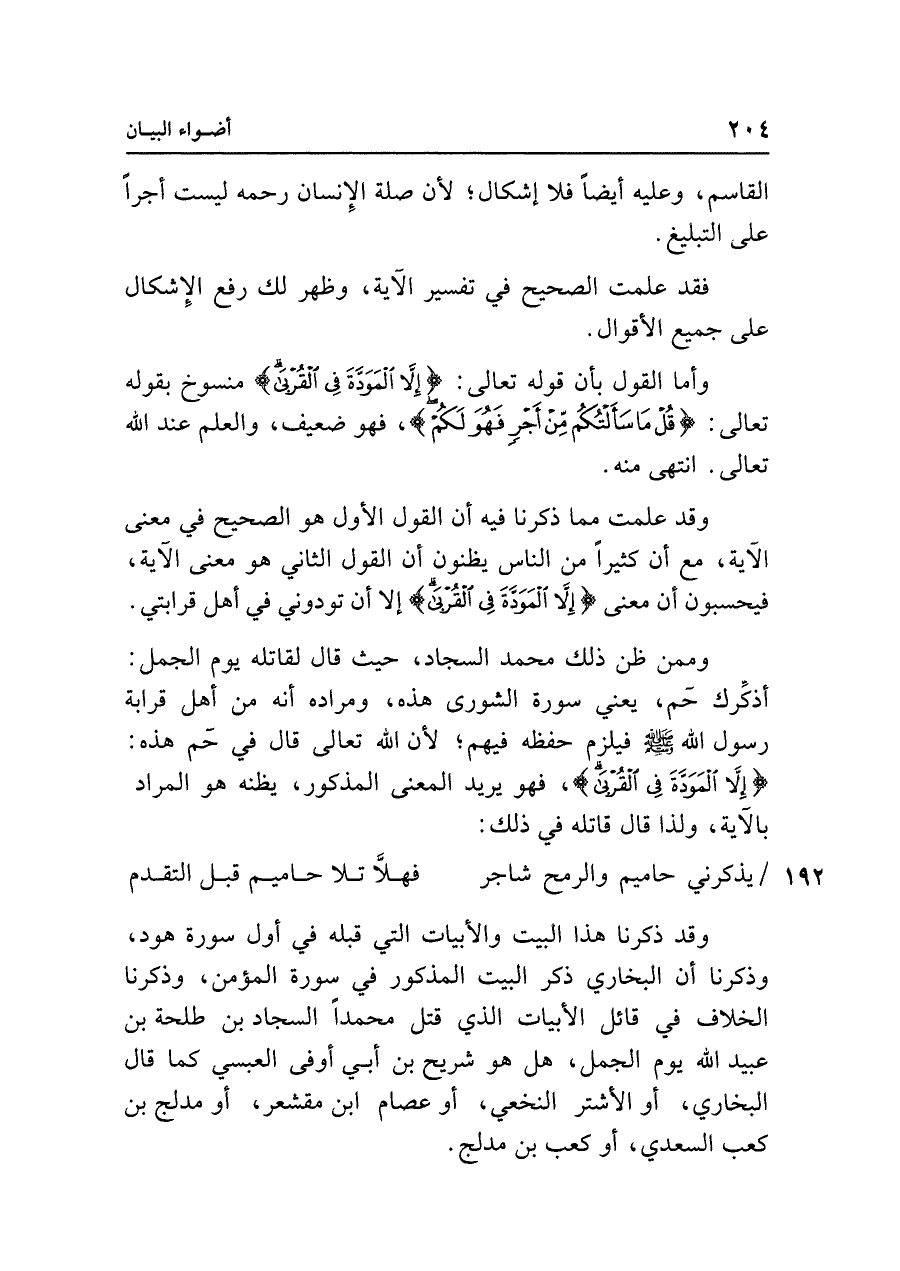 وممن ظن ذلك محمد السجاد، حيث قال لقاتله يوم الجمل: أذكِّرك حم، يعني سورة الشورى هذه، ومراده أنه من أهل قرابة رسول الله - صلى الله عليه وسلم - فيلزم حفظه فيهم؛ لأن الله تعالى قال في حم هذه: {إلا الْمَوَدَّةَ فِي الْقُرْبَى}، فهو يريد المعنى المذكور، يظنه هو المراد بالآية، ولذا قال قاتله في ذلك: