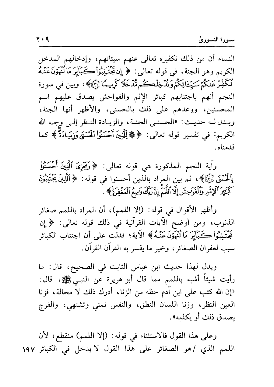 وأظهر الأقوال في قوله: (إلا اللمم)، أن المراد باللمم صغائر الذنوب، ومن أوضح الآيات القرآنية في ذلك قوله تعالى: {إِنْ تَجْتَنِبُوا كَبَائِرَ مَا تُنْهَوْنَ عَنْهُ} الآية؛ فدلت على أن اجتناب الكبائر سبب لغفران الصغائر، وخير ما يفسر به القرآن القرآن.