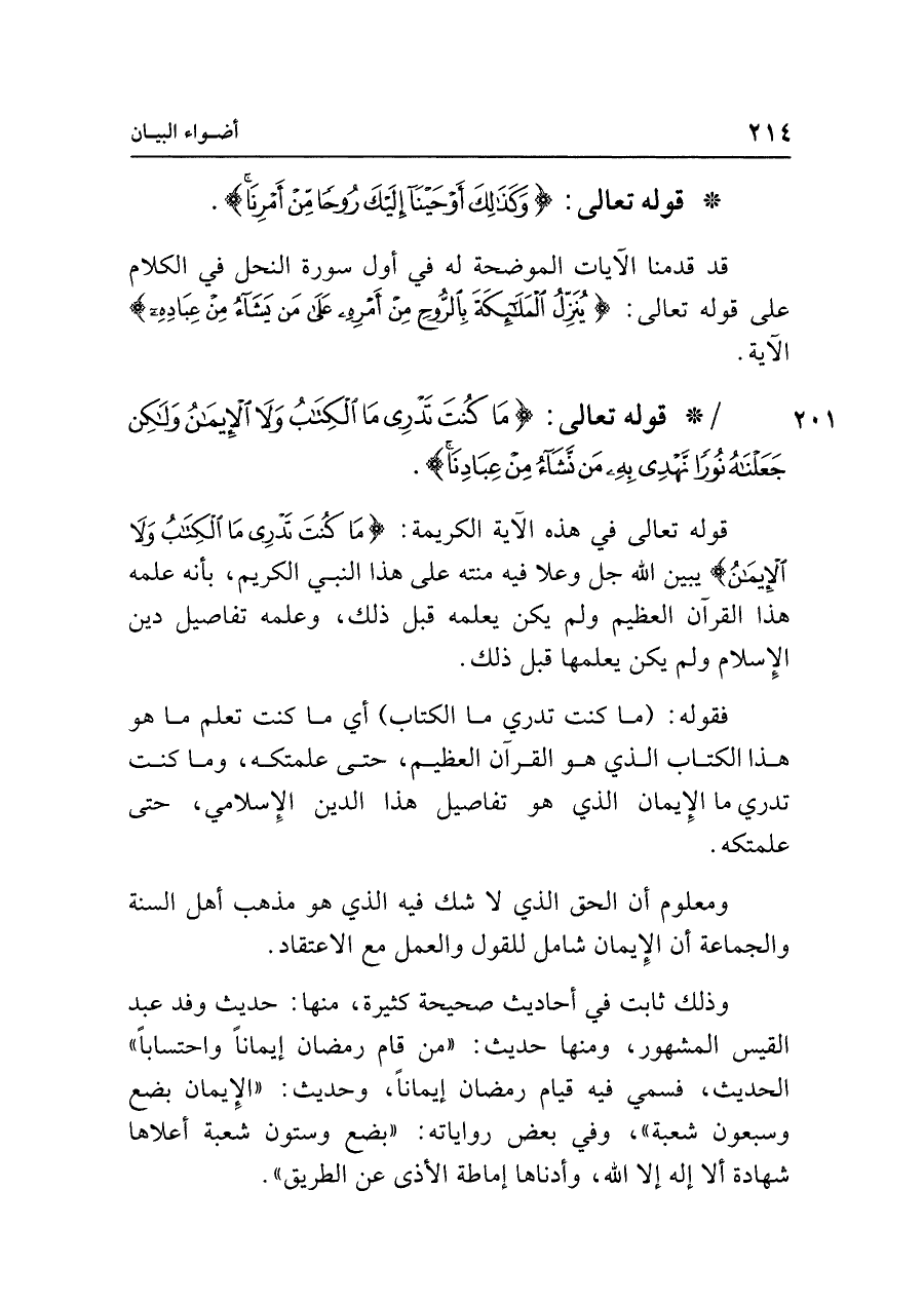 • قوله تعالى: {مَا كُنْتَ تَدْرِي مَا الْكِتَابُ وَلَا الْإِيمَانُ وَلَكِنْ جَعَلْنَاهُ نُورًا نَهْدِي بِهِ مَنْ نَشَاءُ مِنْ عِبَادِنَا}.