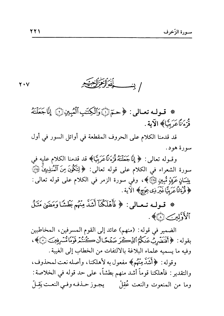 • قوله تعالى: {حم (١) وَالْكِتَابِ الْمُبِينِ (٢) إِنَّا جَعَلْنَاهُ قُرْآنًا عَرَبِيًّا} الآية.