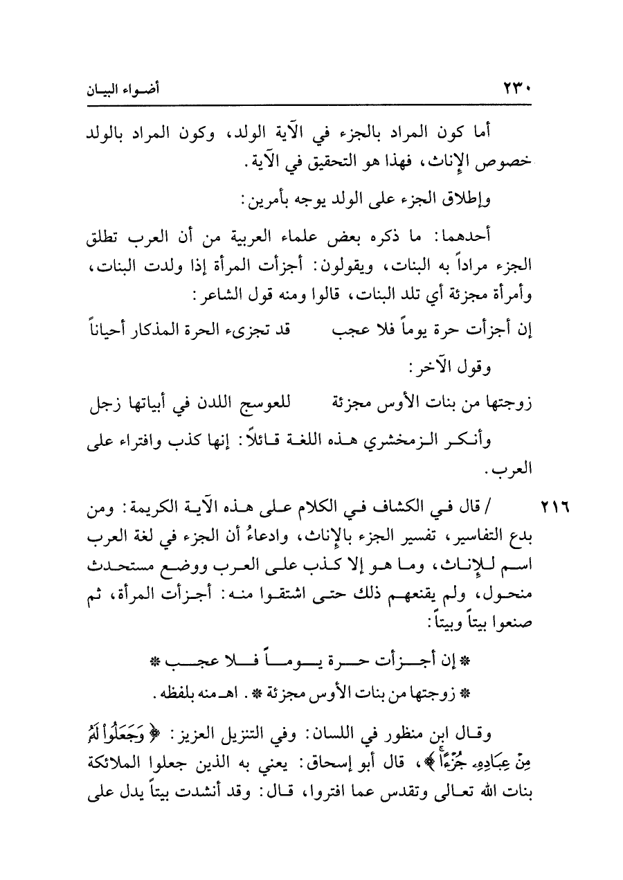 قال في الكشاف في الكلام على هذه الآية الكريمة: ومن بدع التفاسير، تفسير الجزء بالإِناث، وادعاءُ أن الجزء في لغة العرب اسم للإِناث، وما هو إلا كذب على العرب ووضع مستحدث منحول، ولم يقنعهم ذلك حتى اشتقوا منه: أجزأت المرأة، ثم صنعوا بيتًا وبيتًا: