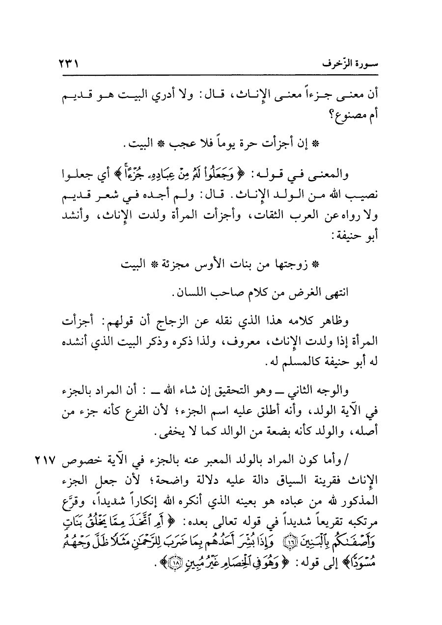 وأما كون المراد بالولد المعبر عنه بالجزء في الآية خصوص الإِناث فقرينة السياق دالة عليه دلالة واضحة؛ لأن جعل الجزء المذكور لله من عباده هو بعينه الذي أنكره الله إنكارًا شديدًا، وقرَّع مرتكبه تقريعًا شديدًا في قوله تعالى بعده: {أَمِ اتَّخَذَ مِمَّا يَخْلُقُ بَنَاتٍ وَأَصْفَاكُمْ بِالْبَنِينَ (١٦) وَإِذَا بُشِّرَ أَحَدُهُمْ بِمَا ضَرَبَ لِلرَّحْمَنِ مَثَلًا ظَلَّ وَجْهُهُ مُسْوَدًّا} إلى قوله: {وَهُوَ فِي الْخِصَامِ غَيرُ مُبِينٍ (١٨)}.