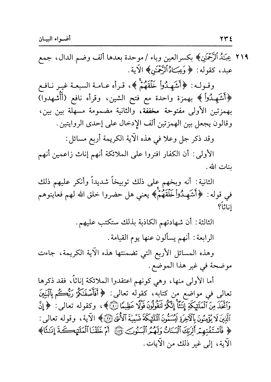 الثانية: أنه وبخهم على ذلك توبيخًا شديدًا وأنكر عليهم ذلك في قوله: {أَشَهِدُوا خَلْقَهُمْ} يعني هل حضروا خلق الله لهم فعاينوهم إناثًا؟