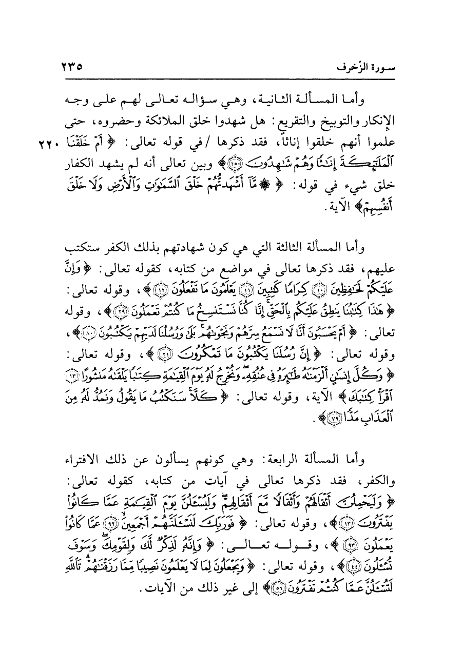 وأما المسألة الرابعة: وهي كونهم يسألون عن ذلك الافتراء والكفر، فقد ذكرها تعالى في آيات من كتابه، كقوله تعالى: {وَلَيَحْمِلُنَّ أَثْقَالهُمْ وَأَثْقَالًا مَعَ أَثْقَالِهِمْ وَلَيُسْأَلُنَّ يَوْمَ الْقِيَامَةِ عَمَّا كَانُوا يَفْتَرُونَ (١٣)}، وقوله تعالى: {فَوَرَبِّكَ لَنَسْأَلَنَّهُمْ أَجْمَعِينَ (٩٢) عَمَّا كَانُوا يَعْمَلُونَ (٩٣)}، وقوله تعالى: {وَإِنَّهُ لَذِكْرٌ لَكَ وَلِقَوْمِكَ وَسَوْفَ تُسْأَلُونَ (٤٤)}، وقوله تعالى: {وَيَجْعَلُونَ لِمَا لَا يَعْلَمُونَ نَصِيبًا مِمَّا رَزَقْنَاهُمْ تَاللَّهِ لَتُسْأَلُنَّ عَمَّا كُنْتُمْ تَفْتَرُونَ (٥٦)} إلى غير ذلك من الآيات.