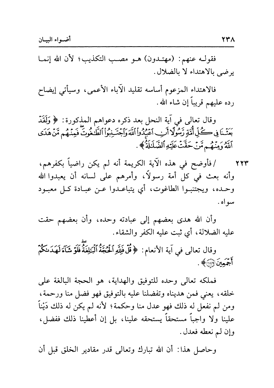 وقال تعالى في آية النحل بعد ذكره دعواهم المذكورة: {وَلَقَدْ بَعَثْنَا فِي كُلِّ أُمَّةٍ رَسُولًا أَنِ اعْبُدُوا اللَّهَ وَاجْتَنِبُوا الطَّاغُوتَ فَمِنْهُمْ مَنْ هَدَى اللَّهُ وَمِنْهُمْ مَنْ حَقَّتْ عَلَيهِ الضَّلَالةُ}.