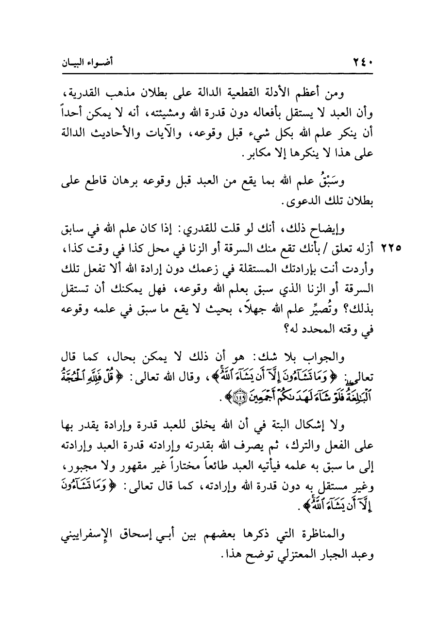 وإيضاح ذلك، أنك لو قلت للقدري: إذا كان علم الله في سابق أزله تعلق بأنك تقع منك السرقة أو الزنا في محل كذا في وقت كذا، وأردت أنت بإرادتك المستقلة في زعمك دون إرادة الله ألا تفعل تلك السرقة أو الزنا الذي سبق بعلم الله وقوعه، فهل يمكنك أن تستقل بذلك؟ وتُصيِّر علم الله جهلًا، بحيث لا يقع ما سبق في علمه وقوعه في وقته المحدد له؟
