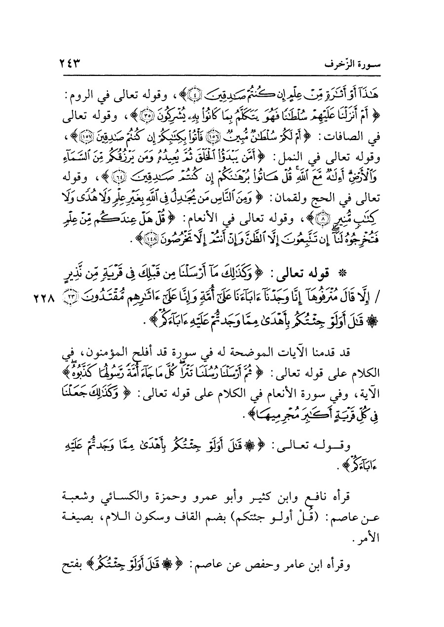 • قوله تعالى: {وَكَذَلِكَ مَا أَرْسَلْنَا مِنْ قَبْلِكَ فِي قَرْيَةٍ مِنْ نَذِيرٍ إلا قَال مُتْرَفُوهَا إِنَّا وَجَدْنَا آبَاءَنَا عَلَى أُمَّةٍ وَإِنَّا عَلَى آثَارِهِمْ مُقْتَدُونَ * قَال أَوَلَوْ جِئْتُكُمْ بِأَهْدَى مِمَّا وَجَدْتُمْ عَلَيهِ آبَاءَكُمْ}.