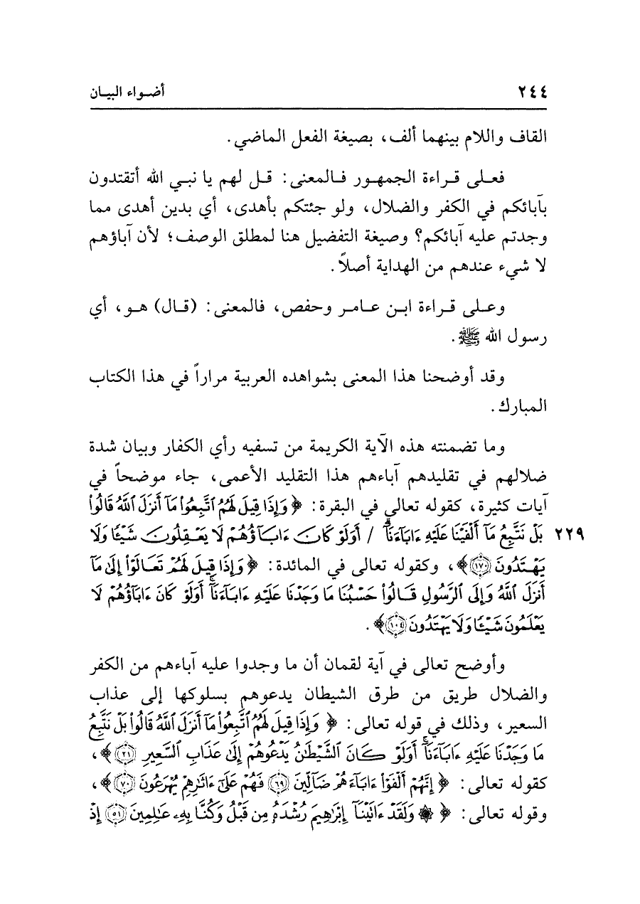 وأوضح تعالى في آية لقمان أن ما وجدوا عليه آباءهم من الكفر والضلال طريق من طرق الشيطان يدعوهم بسلوكها إلى عذاب السعير، وذلك في قوله تعالى: {وَإِذَا قِيلَ لَهُمُ اتَّبِعُوا مَا أَنْزَلَ اللَّهُ قَالُوا بَلْ نَتَّبِعُ مَا وَجَدْنَا عَلَيهِ آبَاءَنَا أَوَلَوْ كَانَ الشَّيطَانُ يَدْعُوهُمْ إِلَى عَذَابِ السَّعِيرِ (٢١)}، كقوله تعالى: {إِنَّهُمْ أَلْفَوْا آبَاءَهُمْ ضَالِّينَ (٦٩) فَهُمْ عَلَى آثَارِهِمْ يُهْرَعُونَ (٧٠)}، وقوله تعالى: {وَلَقَدْ آتَينَا إِبْرَاهِيمَ رُشْدَهُ مِنْ قَبْلُ وَكُنَّا بِهِ عَالِمِينَ (٥١) إِذْ