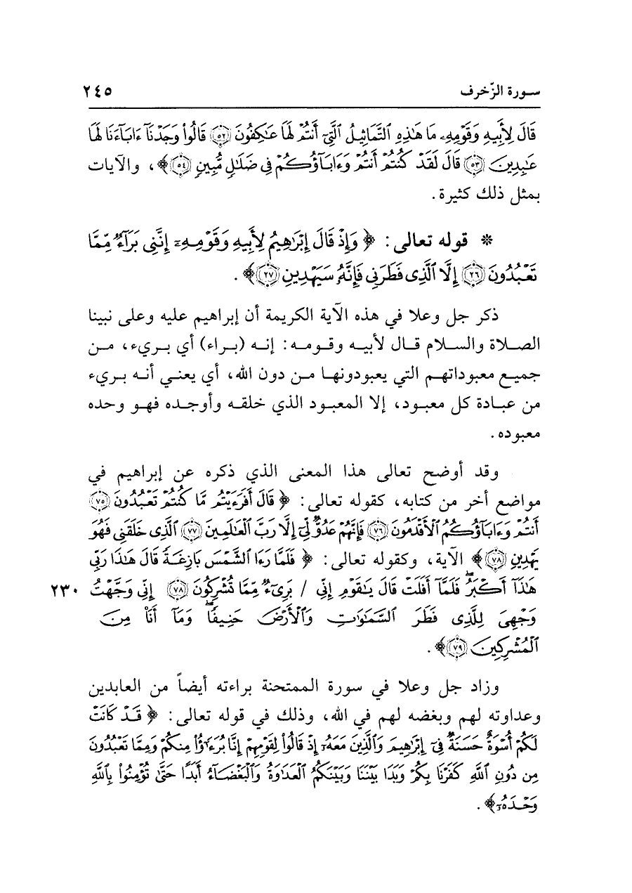 • قوله تعالى: {وَإِذْ قَال إِبْرَاهِيمُ لِأَبِيهِ وَقَوْمِهِ إِنَّنِي بَرَاءٌ مِمَّا تَعْبُدُونَ (٢٦) إلا الَّذِي فَطَرَنِي فَإِنَّهُ سَيَهْدِينِ (٢٧)}.