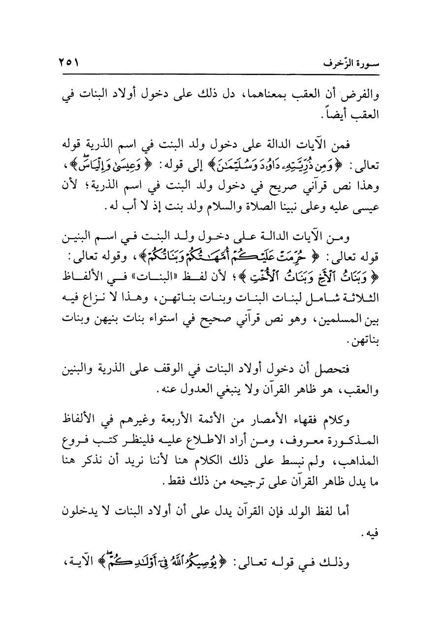 فتحصل أن دخول أولاد البنات في الوقف على الذرية والبنين والعقب، هو ظاهر القرآن ولا ينبغي العدول عنه.