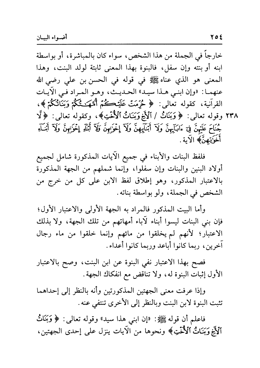 خارجًا في الجملة من هذا الشخص، سواء كان بالمباشرة، أو بواسطة ابنه أو بنته وإن سفل، فالبنوة بهذا المعنى ثابتة لولد البنت، وهذا المعنى هو الذي عناه - صلى الله عليه وسلم - في قوله في الحسن بن علي رضي الله عنهما: "وإن ابني هذا سيد" الحديث، وهو المراد في الآيات القرآنية، كقوله تعالى: {حُرِّمَتْ عَلَيكُمْ أُمَّهَاتُكُمْ وَبَنَاتُكُمْ}، وقوله تعالى: {وَبَنَاتُ الْأَخِ وَبَنَاتُ الْأُخْتِ}، وكقوله تعالى: {لَا جُنَاحَ عَلَيهِنَّ فِي آبَائِهِنَّ وَلَا أَبْنَائِهِنَّ وَلَا إِخْوَانِهِنَّ وَلَا أَبْنَاءِ إِخْوَانِهِنَّ وَلَا أَبْنَاءِ أَخَوَاتِهِنَّ} الآية.
