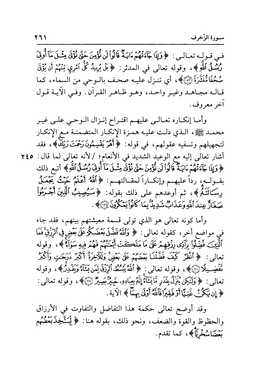 وأما إنكاره تعالى عليهم اقتراح إنزال الوحي على غير محمد - صلى الله عليه وسلم - ، الذي دلت عليه همزة الإِنكار المتضمنة مع الإِنكار لتجهيلهم وتسفيه عقولهم، في قوله: {أَهُمْ يَقْسِمُونَ رَحْمَتَ رَبِّكَ}، فقد أشار تعالى إليه مع الوعيد الشديد في الأنعام؛ لأنه تعالى لما قال: {وَإِذَا جَاءَتْهُمْ آيَةٌ قَالُوا لَنْ نُؤْمِنَ حَتَّى نُؤْتَى مِثْلَ مَا أُوتِيَ رُسُلُ اللَّهِ} بقوله، ردًّا عليهم وإنكارًا لمقالتهم: {اللَّهُ أَعْلَمُ حَيثُ يَجْعَلُ رِسَالتَهُ}، ثم أوعدهم على ذلك بقوله: {سَيُصِيبُ الَّذِينَ أَجْرَمُوا صَغَارٌ عِنْدَ اللَّهِ وَعَذَابٌ شَدِيدٌ بِمَا كَانُوا يَمْكُرُونَ (١٢٤)}.
