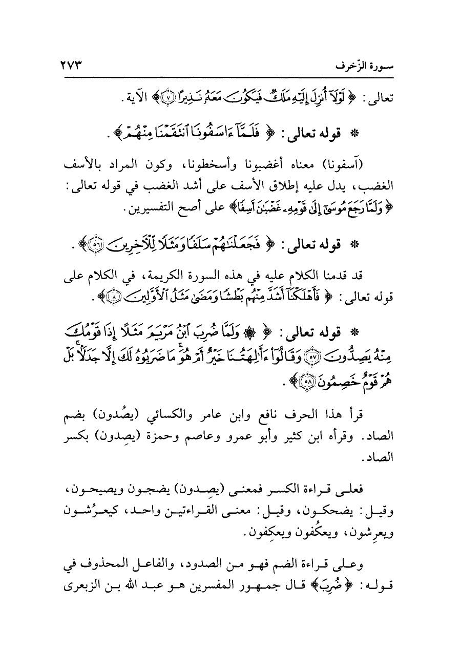 • قوله تعالى {وَلَمَّا ضُرِبَ ابْنُ مَرْيَمَ مَثَلًا إِذَا قَوْمُكَ مِنْهُ يَصِدُّونَ (٥٧) وَقَالُوا أَآلِهَتُنَا خَيرٌ أَمْ هُوَ مَا ضَرَبُوهُ لَكَ إلا جَدَلًا بَلْ هُمْ قَوْمٌ خَصِمُونَ (٥٨)}.
