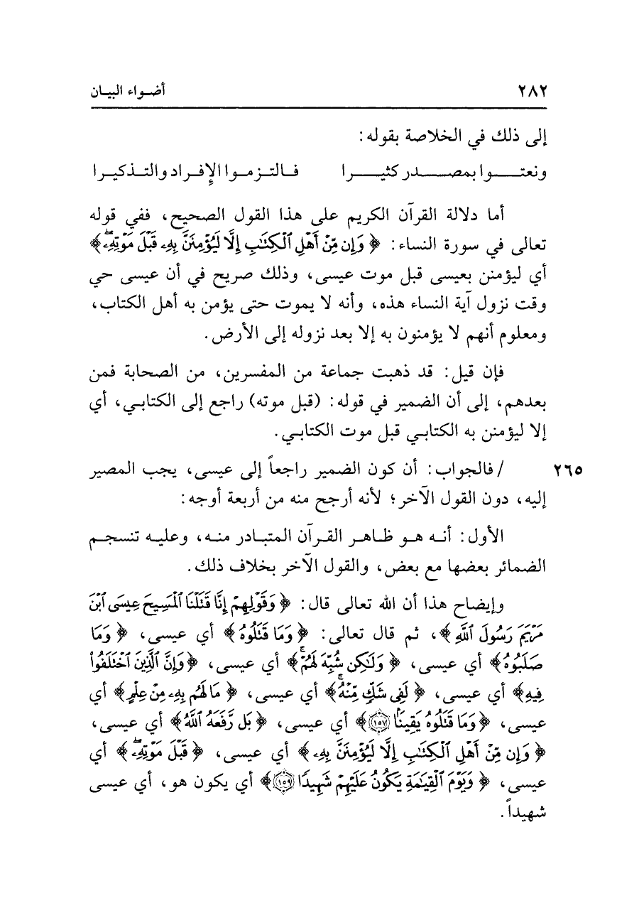 وإيضاح هذا أن الله تعالى قال: {وَقَوْلِهِمْ إِنَّا قَتَلْنَا الْمَسِيحَ عِيسَى ابْنَ مَرْيَمَ رَسُولَ اللَّهِ}، ثم قال تعالى: {وَمَا قَتَلُوهُ} أي عيسى، {وَمَا صَلَبُوهُ} أي عيسى، {وَلَكِنْ شُبِّهَ لَهُمْ} أي عيسى، {وَإِنَّ الَّذِينَ اخْتَلَفُوا فِيهِ} أي عيسى، {لَفِي شَكٍّ مِنْهُ} أي عيسى، {مَا لَهُمْ بِهِ مِنْ عِلْمٍ} أي عيسى، {وَمَا قَتَلُوهُ يَقِينًا (١٥٧)} أي عيسى، {بَلْ رَفَعَهُ اللَّهُ} أي عيسى، {وَإِنْ مِنْ أَهْلِ الْكِتَابِ إلا لَيُؤْمِنَنَّ بِهِ} أي عيسى، {قَبْلَ مَوْتِهِ} أي عيسى، {وَيَوْمَ الْقِيَامَةِ يَكُونُ عَلَيهِمْ شَهِيدًا (١٥٩)} أي يكون هو، أي عيسى شهيدًا.