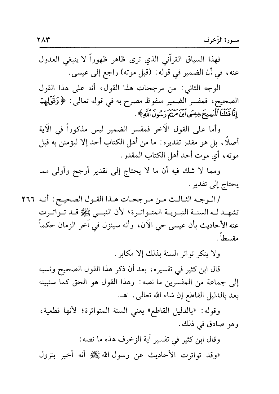 الوجه الثالث من مرجحات هذا القول الصحيح: أنه تشهد له السنة النبوية المتواترة، لأن النبي - صلى الله عليه وسلم - قد تواترت عنه الأحاديث بأن عيسى حي الآن، وأنه سينزل في آخر الزمان حكمًا مقسطًا.