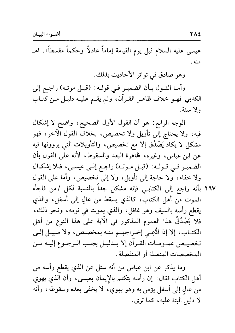 الوجه الرابع: هو أن القول الأول الصحيح، واضح لا إشكال فيه، ولا يحتاج إلى تأويل ولا تخصيص، بخلاف القول الآخر، فهو مشكل لا يكاد يَصْدُق إلا مع تخصيص، والتأويلات التي يروونها فيه عن ابن عباس، وغيره، ظاهرة البعد والسقوط، لأنه على القول بأن الضمير في قوله: (قبل موته) راجع إلى عيسى، فلا إشكال ولا خفاء، ولا حاجة إلى تأويل، ولا إلى تخصيص، وأما على القول بأنه راجع إلى الكتابي فإنه مشكل جدًّا بالنسبة لكل من فاجأه الموت من أهل الكتاب، كالذي يسقط من عالٍ إلى أسفل، والذي يقطع رأسه بالسيف وهو غافل، والذي يموت في نومه، ونحو ذلك، فلا يَصْدُقُ هذا العموم المذكور في الآية على هذا النوع من أهل الكتاب، إلا إذا ادُّعِي إخراجهم منه بمخصص، ولا سبيل إلى تخصيص عمومات القرآن إلا بدليل جب الرجوع إليه من المخصصات المتصلة أو المنفصلة.