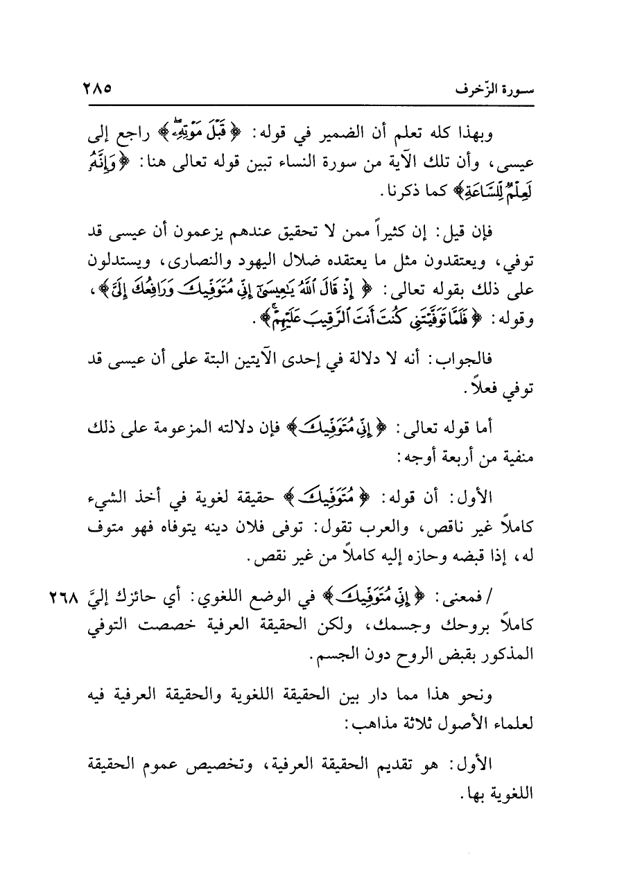الأول: أن قوله: {مُتَوَفِّيكَ} حقيقة لغوية في أخذ الشيء كاملًا غير ناقص، والعرب تقول: توفى فلان دينه يتوفاه فهو متوف له، إذا قبضه وحازه إليه كاملًا من غير نقص.