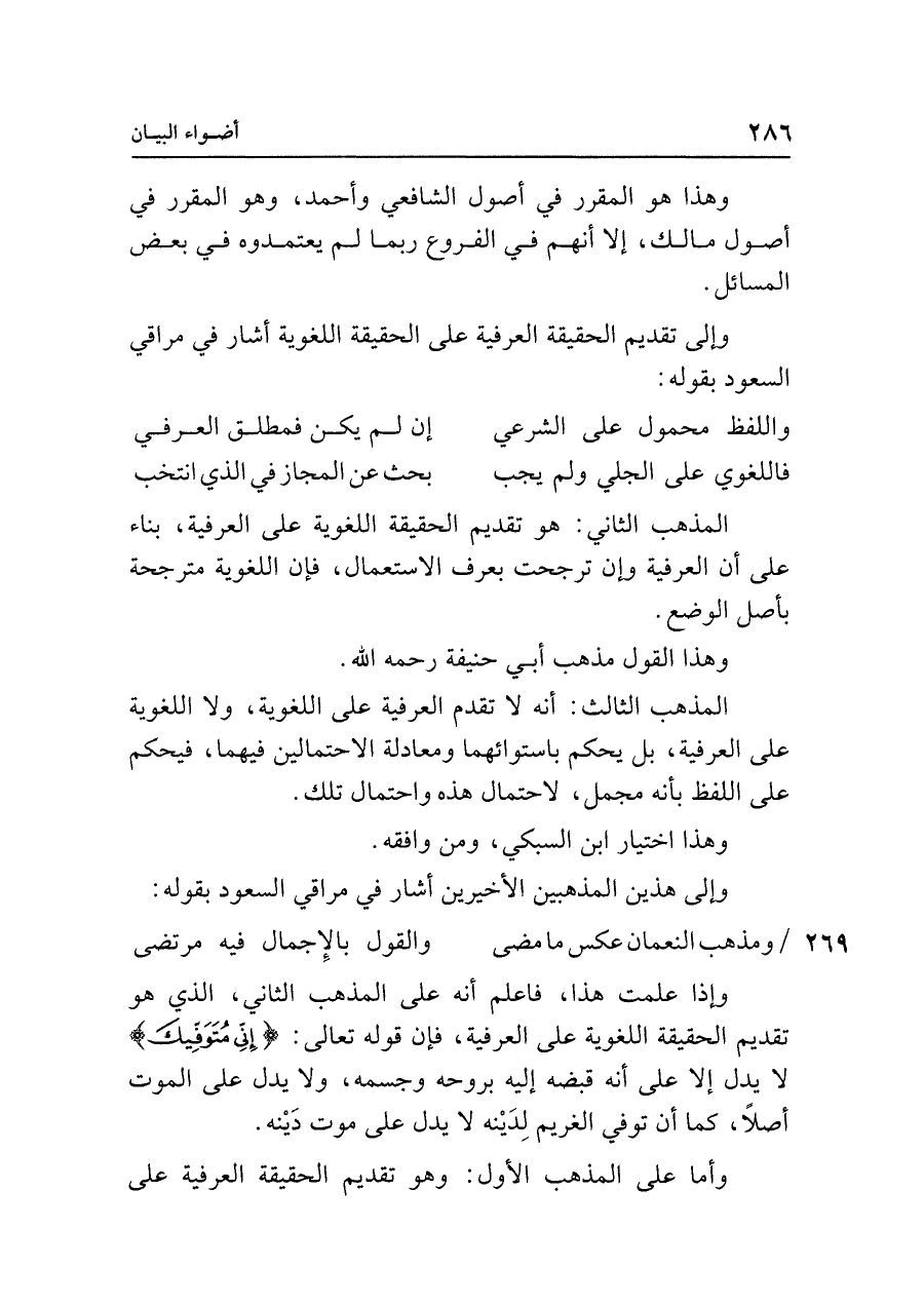 وإذا علمت هذا، فاعلم أنه على المذهب الثاني، الذي هو تقديم الحقيقة اللغوية على العرفية، فإن قوله تعالى: {إِنِّي مُتَوَفِّيكَ} لا يدل إلا على أنه قبضه إليه بروحه وجسمه، ولا يدل على الموت أصلًا، كما أن توفي الغريم لِدَينه لا يدل على موت دَينه.