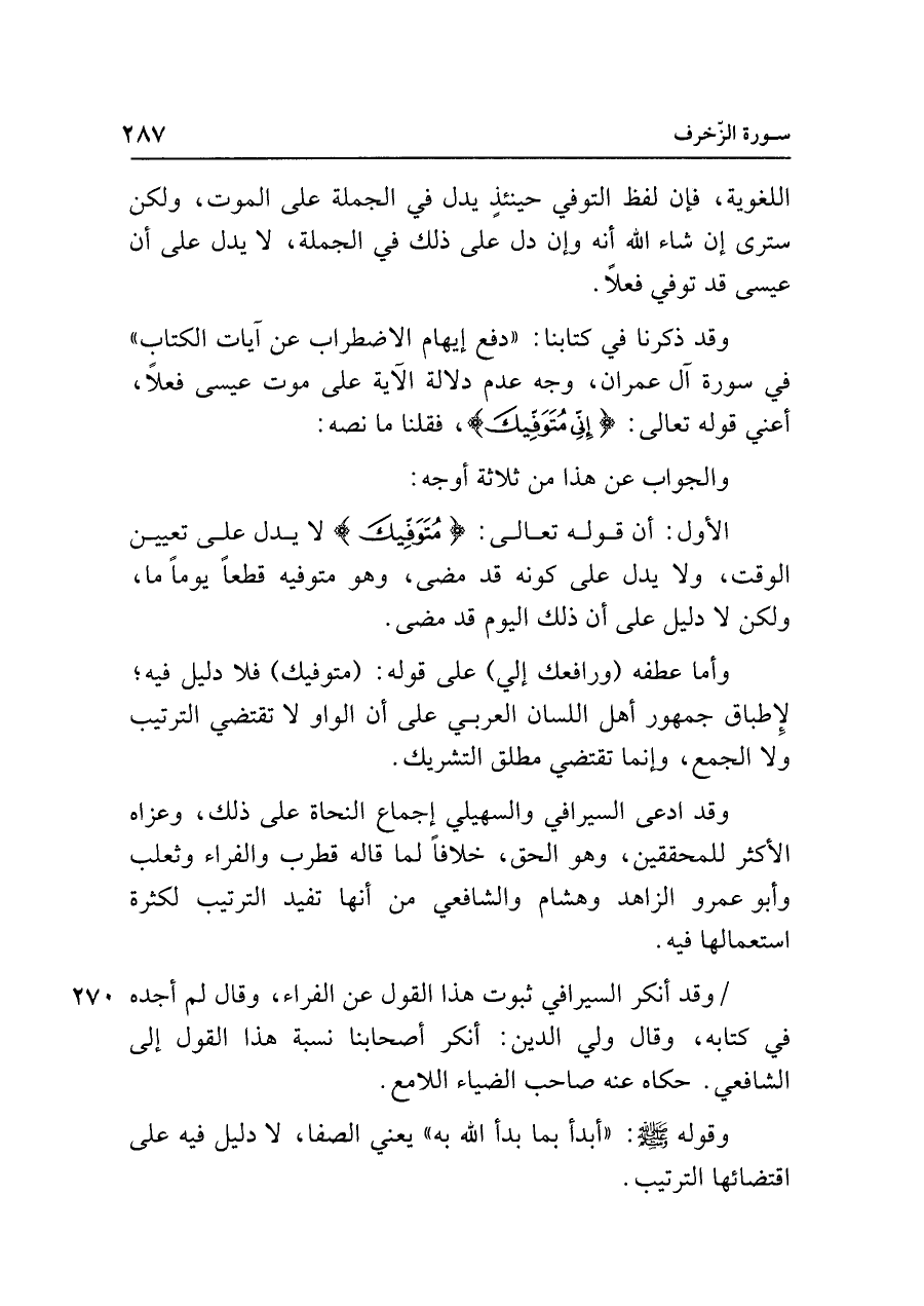 وأما عطفه (ورافعك إلي) على قوله: (متوفيك) فلا دليل فيه؛ لإِطباق جمهور أهل اللسان العربي على أن الواو لا تقتضي الترتيب ولا الجمع، وإنما تقتضي مطلق التشريك.