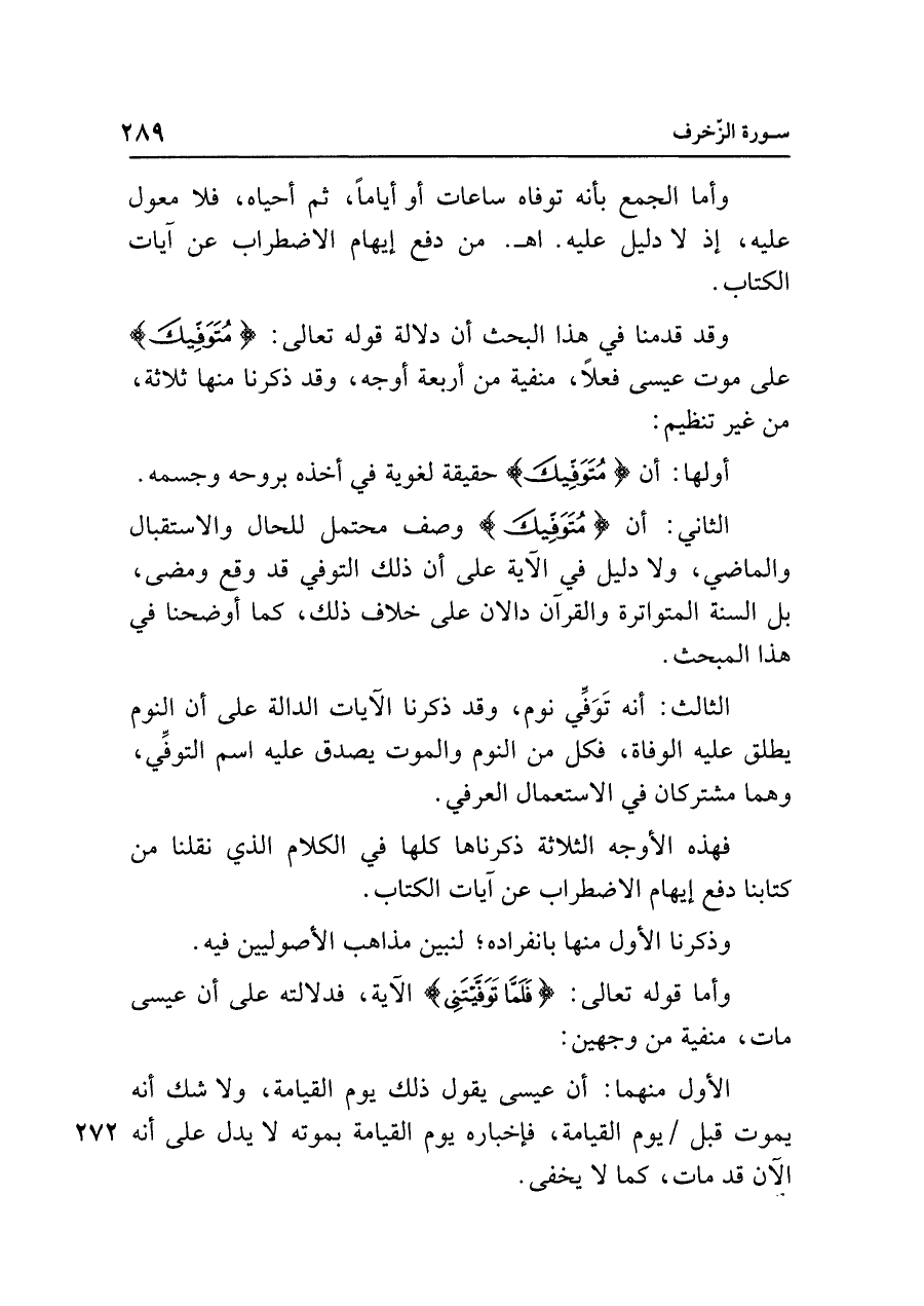 وقد قدمنا في هذا البحث أن دلالة قوله تعالى: {مُتَوَفِّيكَ} على موت عيسى فعلًا، منفية من أربعة أوجه، وقد ذكرنا منها ثلاثة، من غير تنظيم: