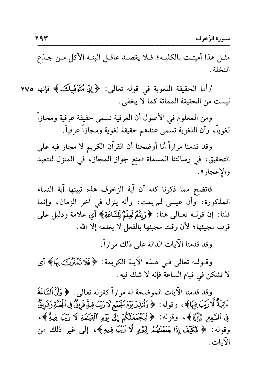 وقد قدمنا مرارًا أنا أوضحنا أن القرآن الكريم لا مجاز فيه على التحقيق، في رسالتنا المسماة "منع جواز المجاز، في المنزل للتعبد والإِعجاز".