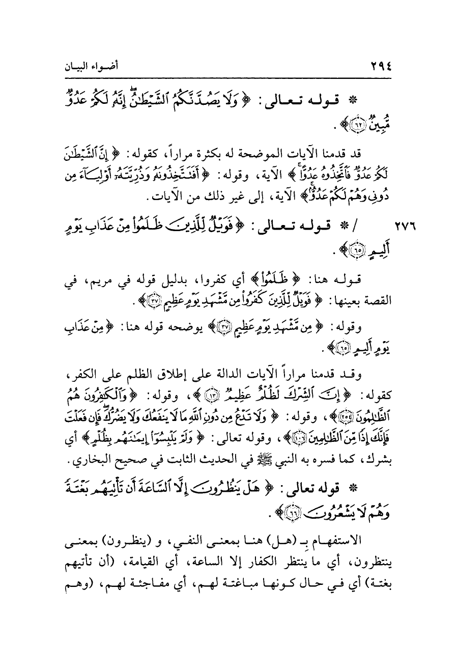 • قوله تعالى: {وَلَا يَصُدَّنَّكُمُ الشَّيطَانُ إِنَّهُ لَكُمْ عَدُوٌّ مُبِينٌ (٦٢)}.
