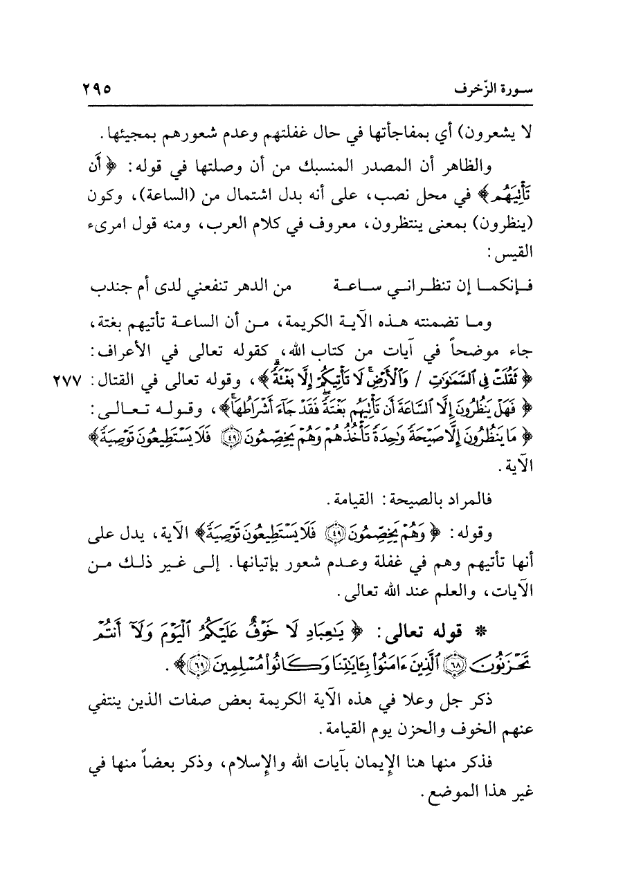 • قوله تعالى: {يَاعِبَادِ لَا خَوْفٌ عَلَيكُمُ الْيَوْمَ وَلَا أَنْتُمْ تَحْزَنُونَ (٦٨) الَّذِينَ آمَنُوا بِآيَاتِنَا وَكَانُوا مُسْلِمِينَ (٦٩)}.