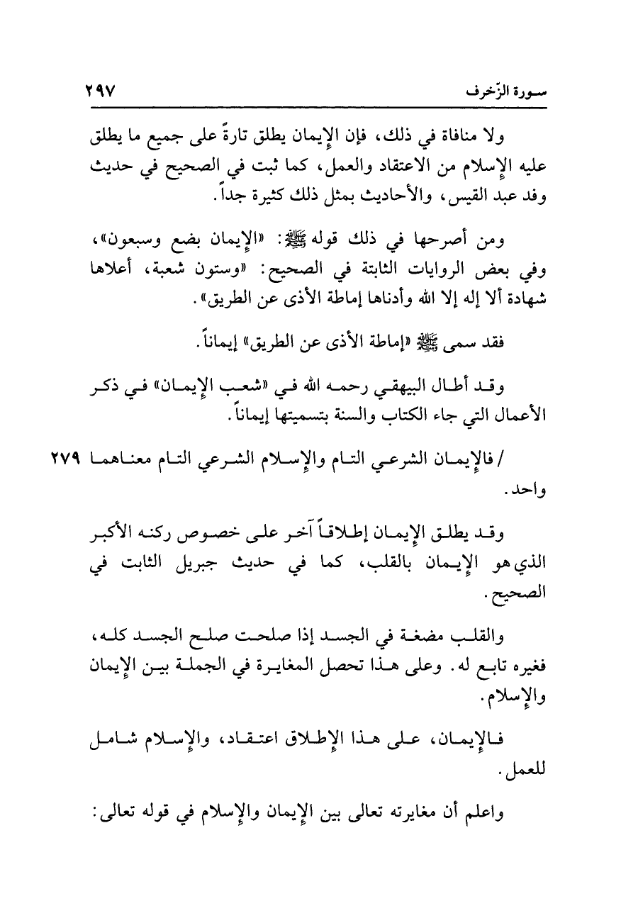 ولا منافاة في ذلك، فإن الإيمان يطلق تارةً على جميع ما يطلق عليه الإِسلام من الاعتقاد والعمل، كما ثبت في الصحيح في حديث وفد عبد القيس، والأحاديث بمثل ذلك كثيرة جدًّا.