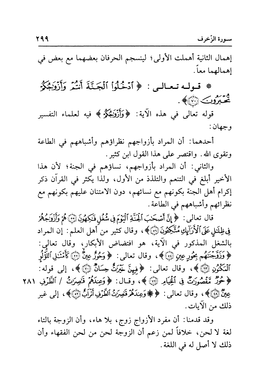 والثاني: أن المراد بأزواجهم، نساؤهم في الجنة، لأن هذا الأخير أبلغ في التنعم والتلذذ من الأول، ولذا يكثر في القرآن ذكر إكرام أهل الجنة بكونهم مع نسائهم، دون الامتنان عليهم بكونهم مع نظرائهم وأشباههم في الطاعة.