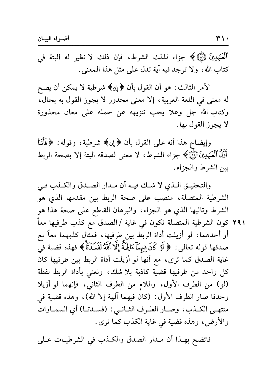 والتحقيق الذي لا شك فيه أن مدار الصدق والكذب في الشرطية المتصلة، منصب على صحة الربط بين مقدمها الذي هو الشرط وتاليها الذي هو الجزاء، والبرهان القاطع على صحة هذا هو كون الشرطية المتصلة تكون في غاية الصدق مع كذب طرفيها معًا أو أحدهما، لو أزيلت أداة الربط بين طرفيها، فمثال كذبهما معًا مع صدقها قوله تعالى: {لَوْ كَانَ فِيهِمَا آلِهَةٌ إلا اللَّهُ لَفَسَدَتَا} فهذه قضية في غاية الصدق كما ترى، مع أنها لو أزيلت أداة الربط بين طرفيها كان كل واحد من طرفيها قضية كاذبة بلا شك، ونعني بأداة الربط لفظة (لو) من الطرف الأول، واللام من الطرف الثاني، فإنهما لو أزيلا وحذفا صار الطرف الأول: (كان فيهما آلهة إلا الله)، وهذه قضية في منتهى الكذب، وصار الطرف الثاني: (فسدتا) أي السماوات والأرض، وهذه قضية في غاية الكذب كما ترى.
