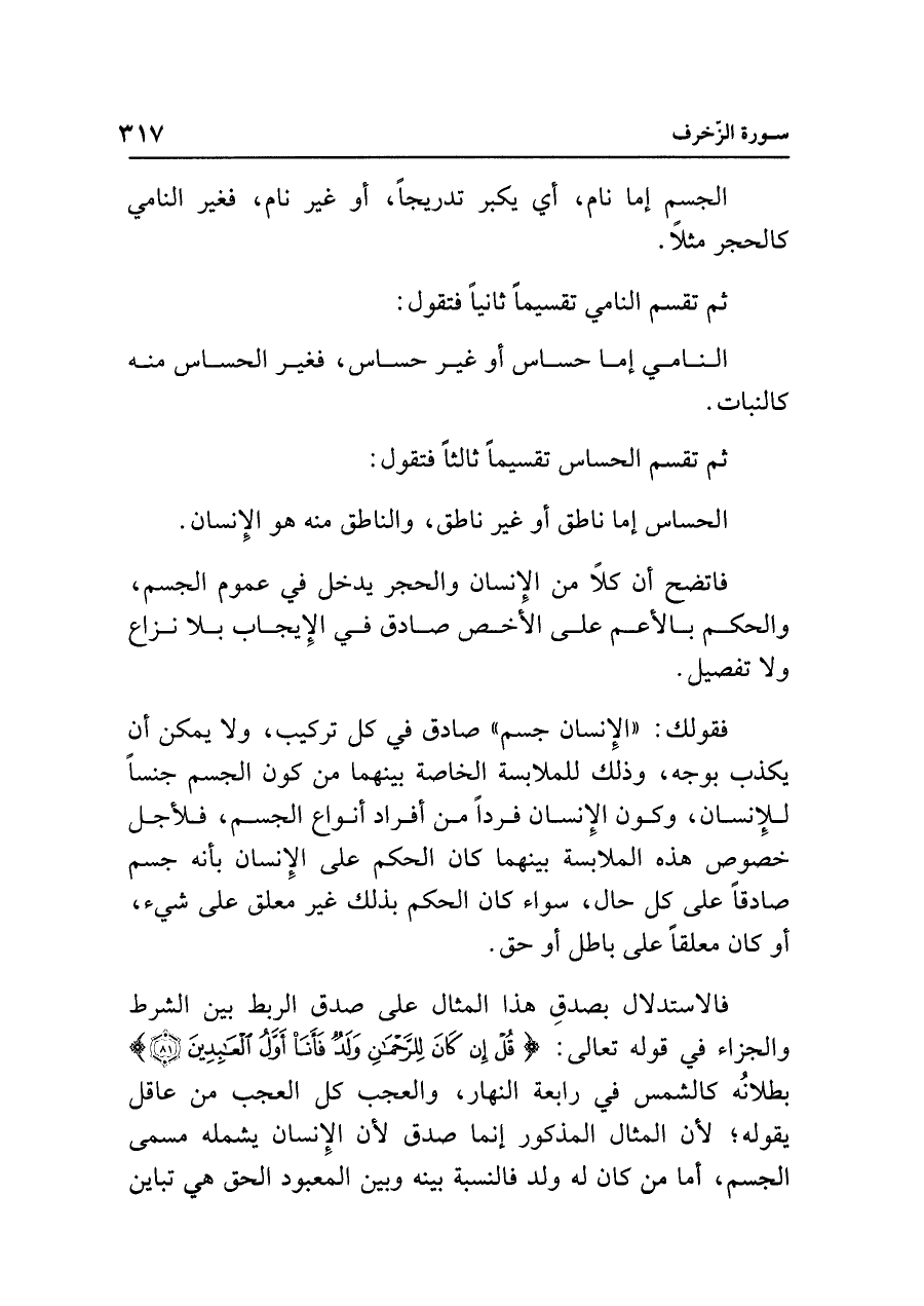 فالاستدلال بصدق هذا المثال على صدق الربط بين الشرط والجزاء في قوله تعالى: {قُلْ إِنْ كَانَ لِلرَّحْمَنِ وَلَدٌ فَأَنَا أَوَّلُ الْعَابِدِينَ (٨١)} بطلانُه كالشمس في رابعة النهار، والعجب كل العجب من عاقل يقوله؛ لأن المثال المذكور إنما صدق لأن الإِنسان يشمله مسمى الجسم، أما من كان له ولد فالنسبة بينه وبين المعبود الحق هي تباين