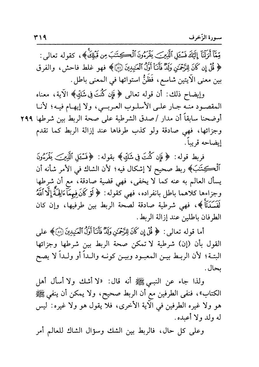 أما قوله تعالى: {قُلْ إِنْ كَانَ لِلرَّحْمَنِ وَلَدٌ فَأَنَا أَوَّلُ الْعَابِدِينَ (٨١)} على القول بأن (إن) شرطية لا تمكن صحة الربط بين شرطها وجزائها البتة؛ لأن الربط بين المعبود وبين كونه والدًا أو ولدًا لا يصح بحال.