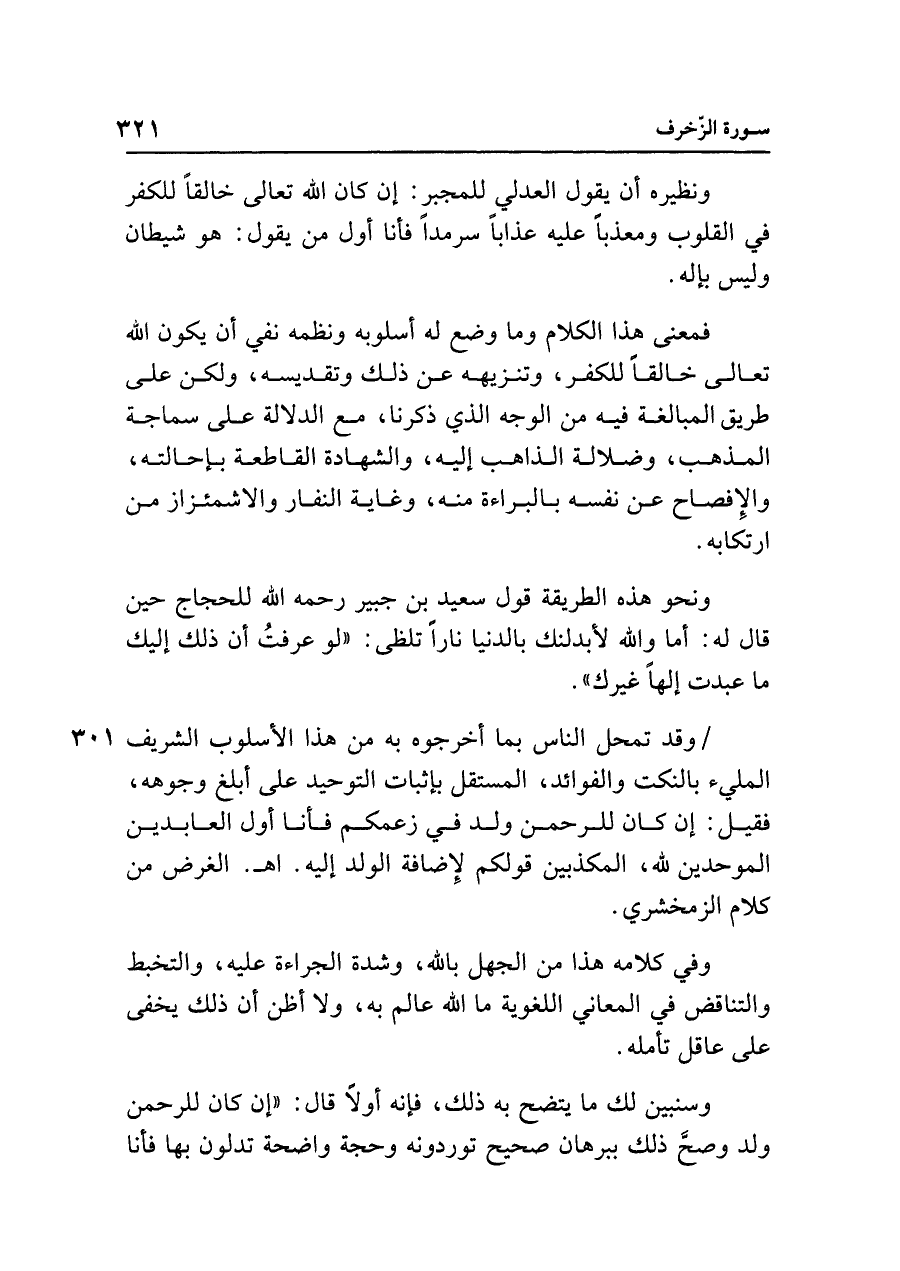 فمعنى هذا الكلام وما وضع له أسلوبه ونظمه نفي أن يكون الله تعالى خالقًا للكفر، وتنزيهه عن ذلك وتقديسه، ولكن على طريق المبالغة فيه من الوجه الذي ذكرنا، مع الدلالة على سماجة المذهب، وضلالة الذاهب إليه، والشهادة القاطعة بإحالته، والإِفصاح عن نفسه بالبراءة منه، وغاية النفار والاشمئزاز من ارتكابه.