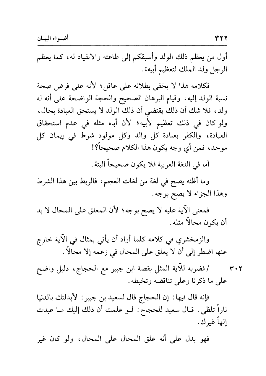 فضربه للآية المثل بقصة ابن جبير مع الحجاج، دليل واضح على ما ذكرنا وعلى تناقضه وتخبطه.