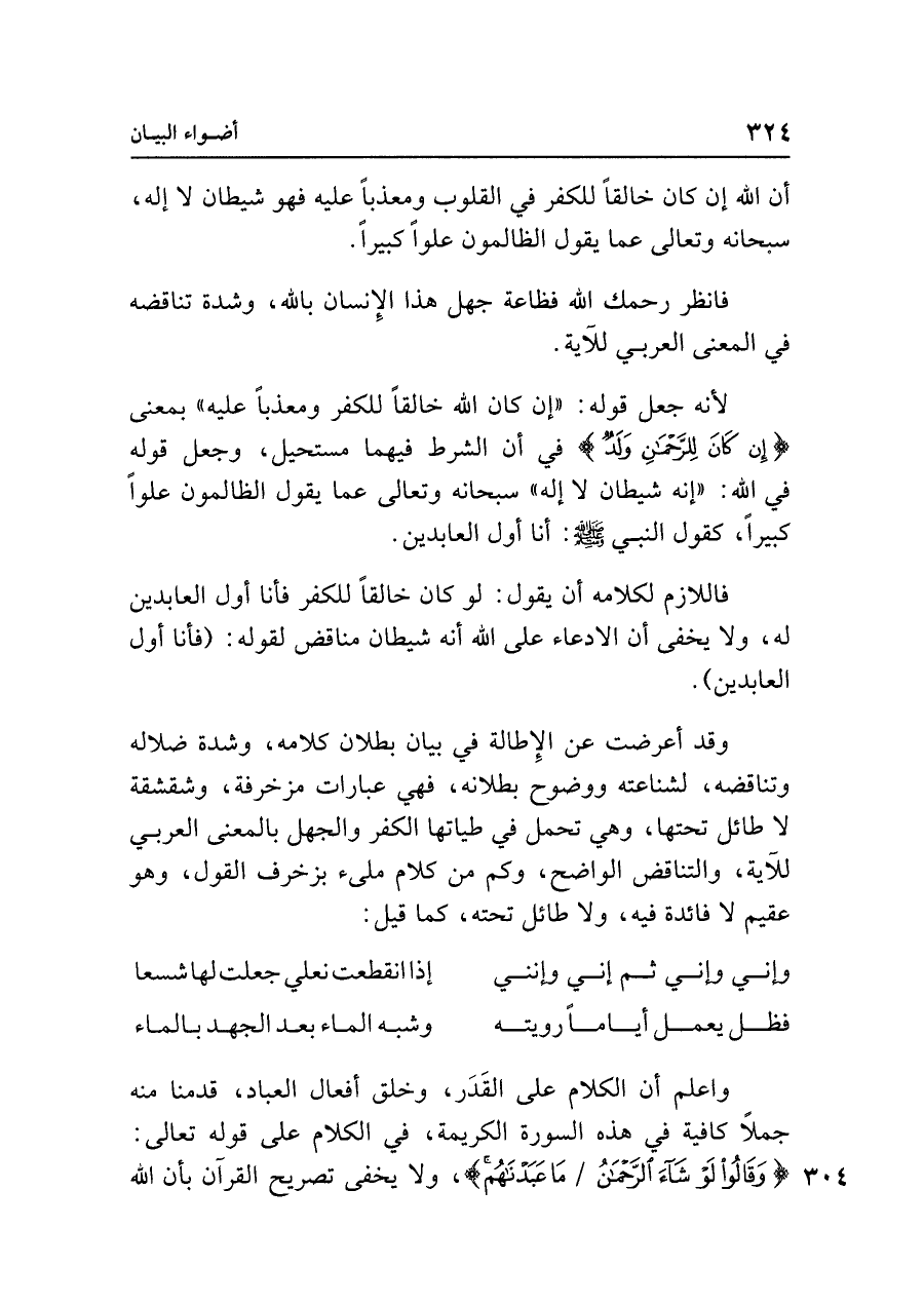 فاللازم لكلامه أن يقول: لو كان خالقًا للكفر فأنا أول العابدين له، ولا يخفى أن الادعاء على الله أنه شيطان مناقض لقوله: (فأنا أول العابدين).
